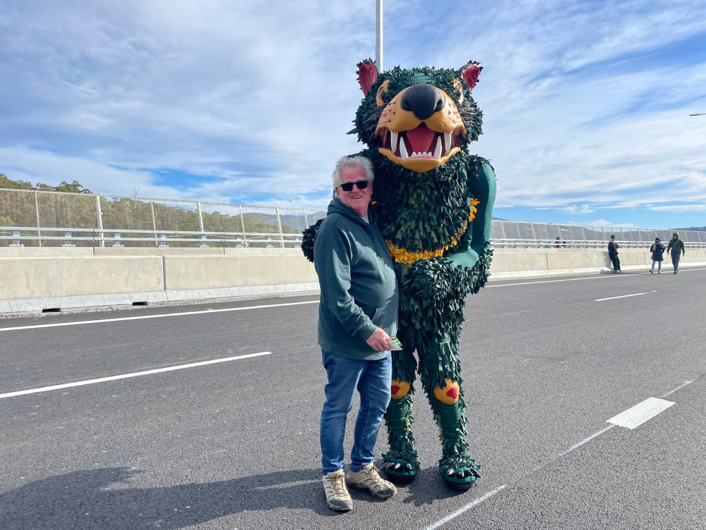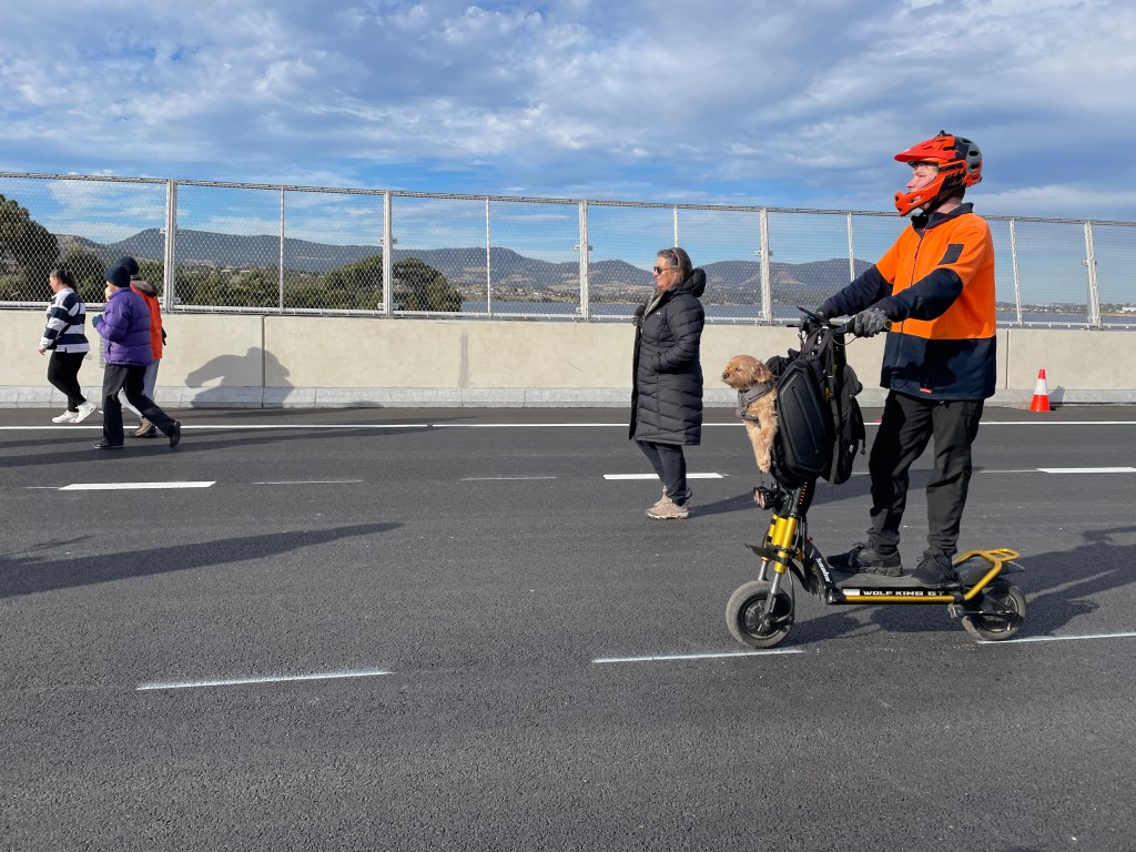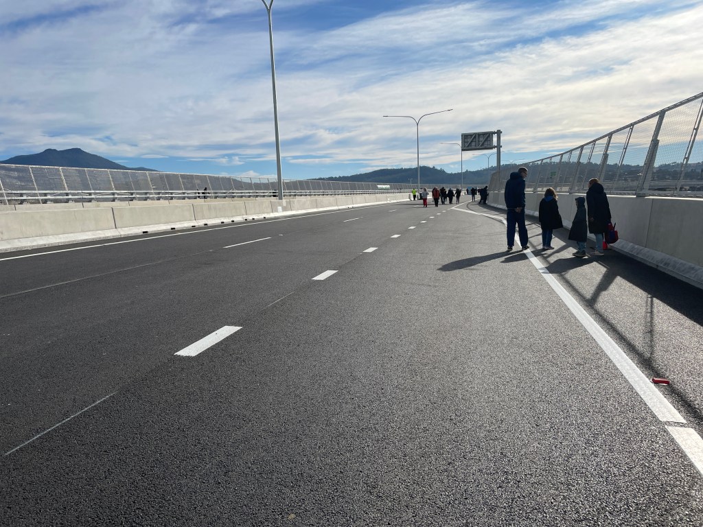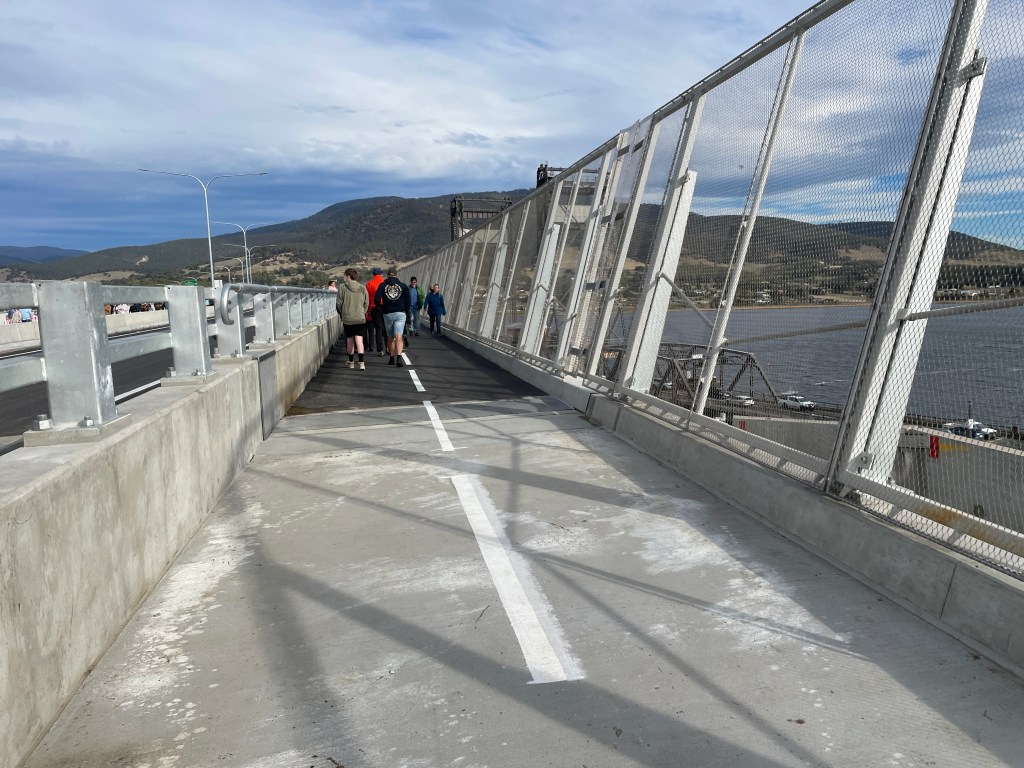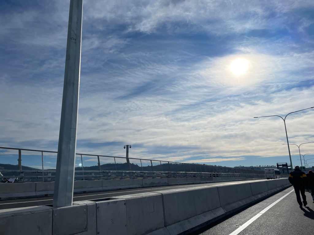 Tonight, local media reported that 12000 people took a walk, approximately one kilometre long across the new bridge, earlier today. Tomorrow the bridge will be open and functional for vehicular traffic but today our feet were the means for propulsion. I made the historic walk with a couple of others and we did a little more than expected. We walked across the bridge from the Granton/city to the Bridgewater side, then down and under the bridge before walking up onto the one pathway designed as part of the bridge. From there we walked back to where we began, caught a shuttle bus and returned to the bridge-walk hub. This was located in and around the very large engineering shed in which many parts of the new bridge had been constructed. Free sizzling sausages on soft white bread with dollops of tomato or barbeque sauce were handed out to all comers as part of the celebration.