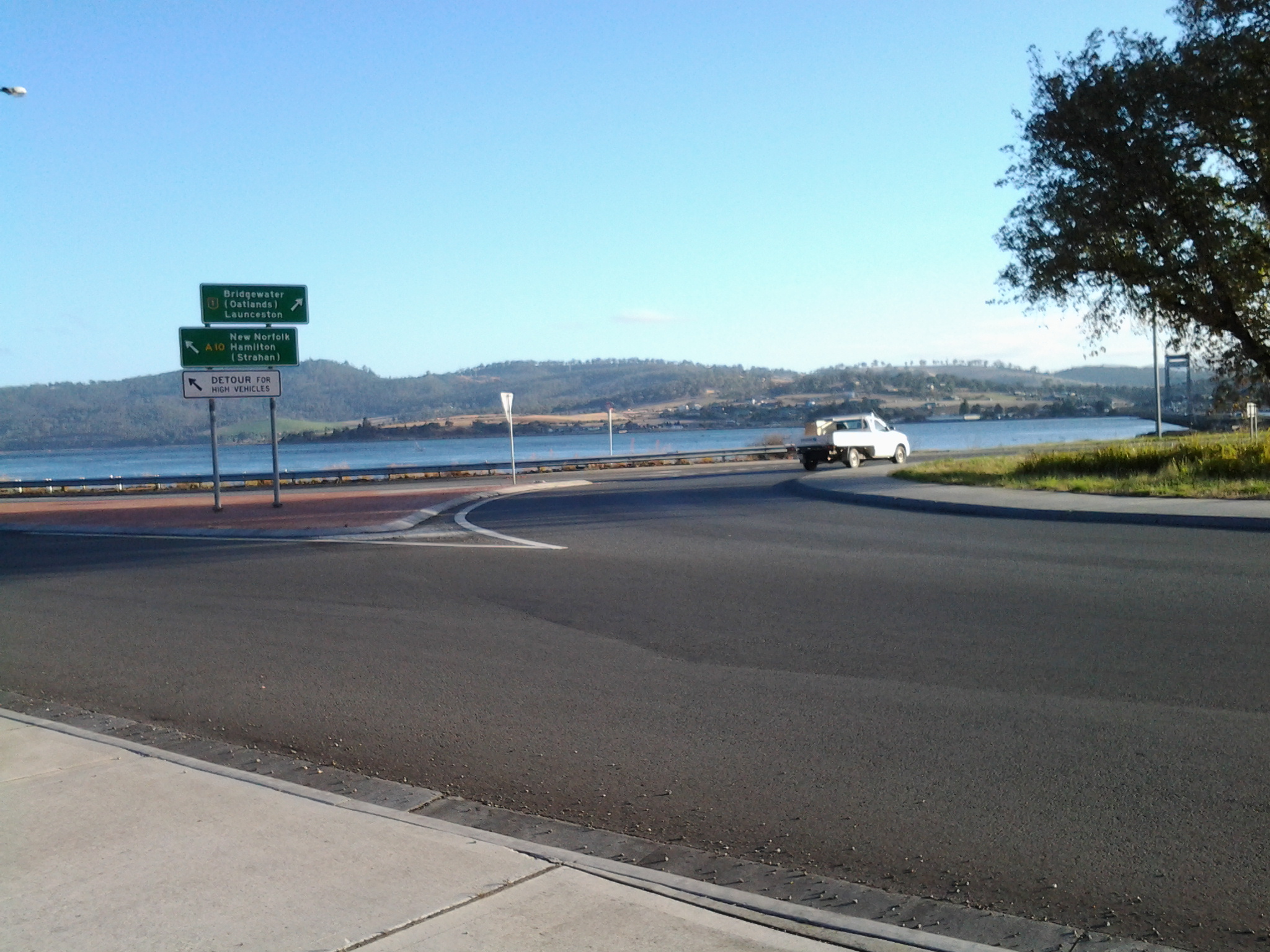 My eyes swung across to the roundabout for vehicles travelling north on the Midlands Highway to Launceston via many rural towns. In the distance, the vertical towers of the Bridgewater Bridge marked the Derwent River crossing. The calmness of the day, and the quality of the light was sublime.