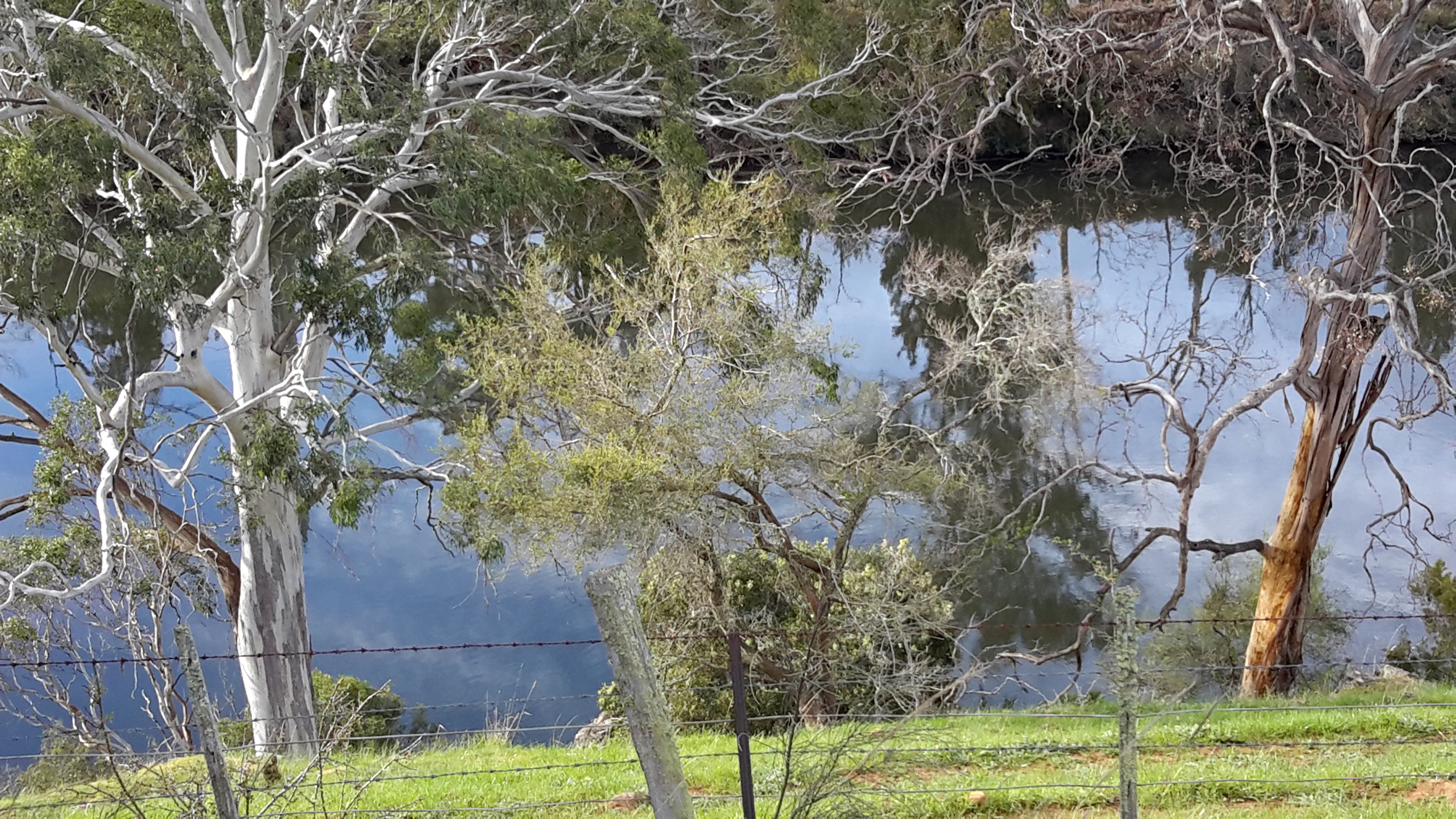 Photo of the Derwent River taken through a house block on the western edge of the town of New Norfolk.