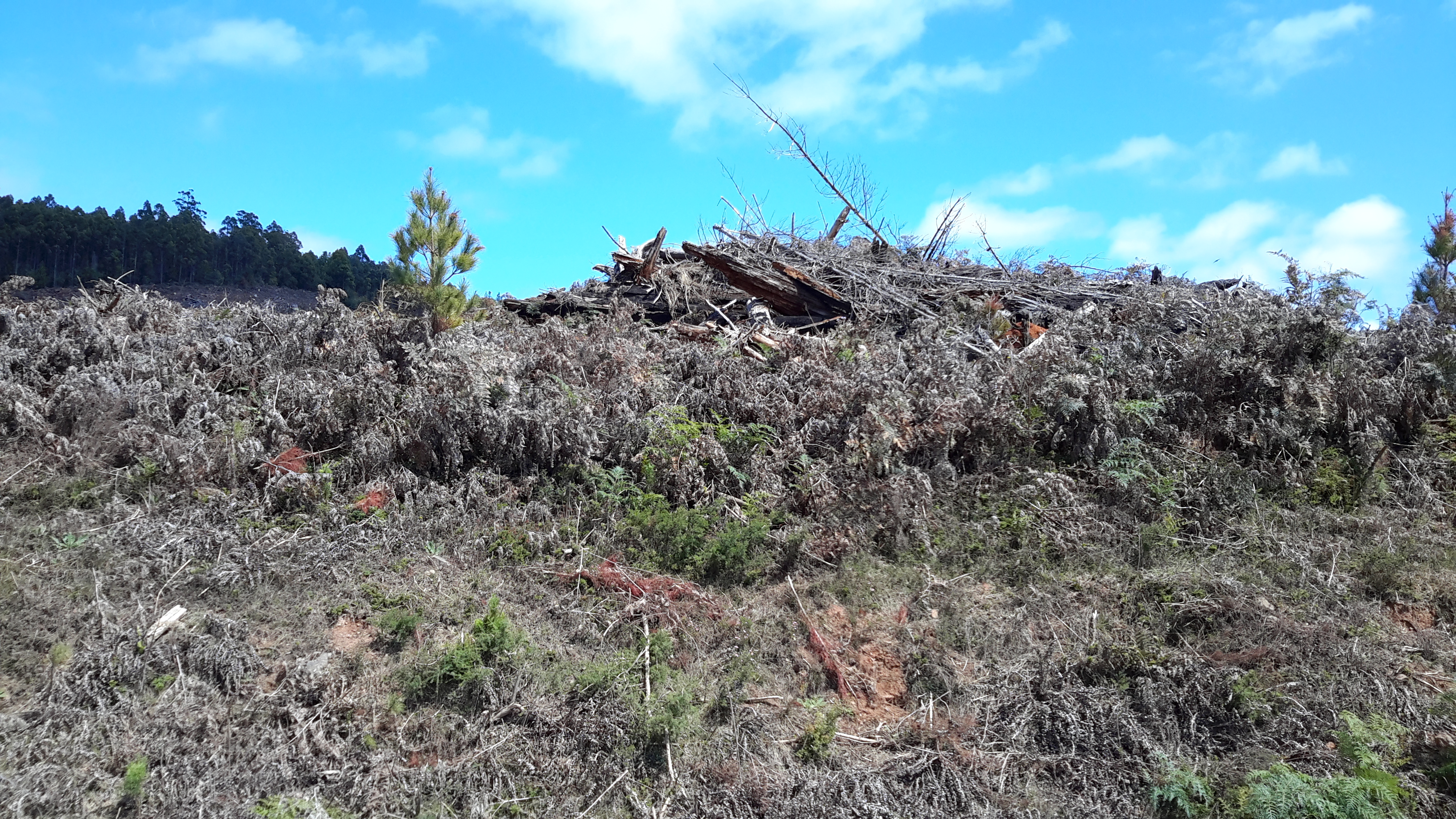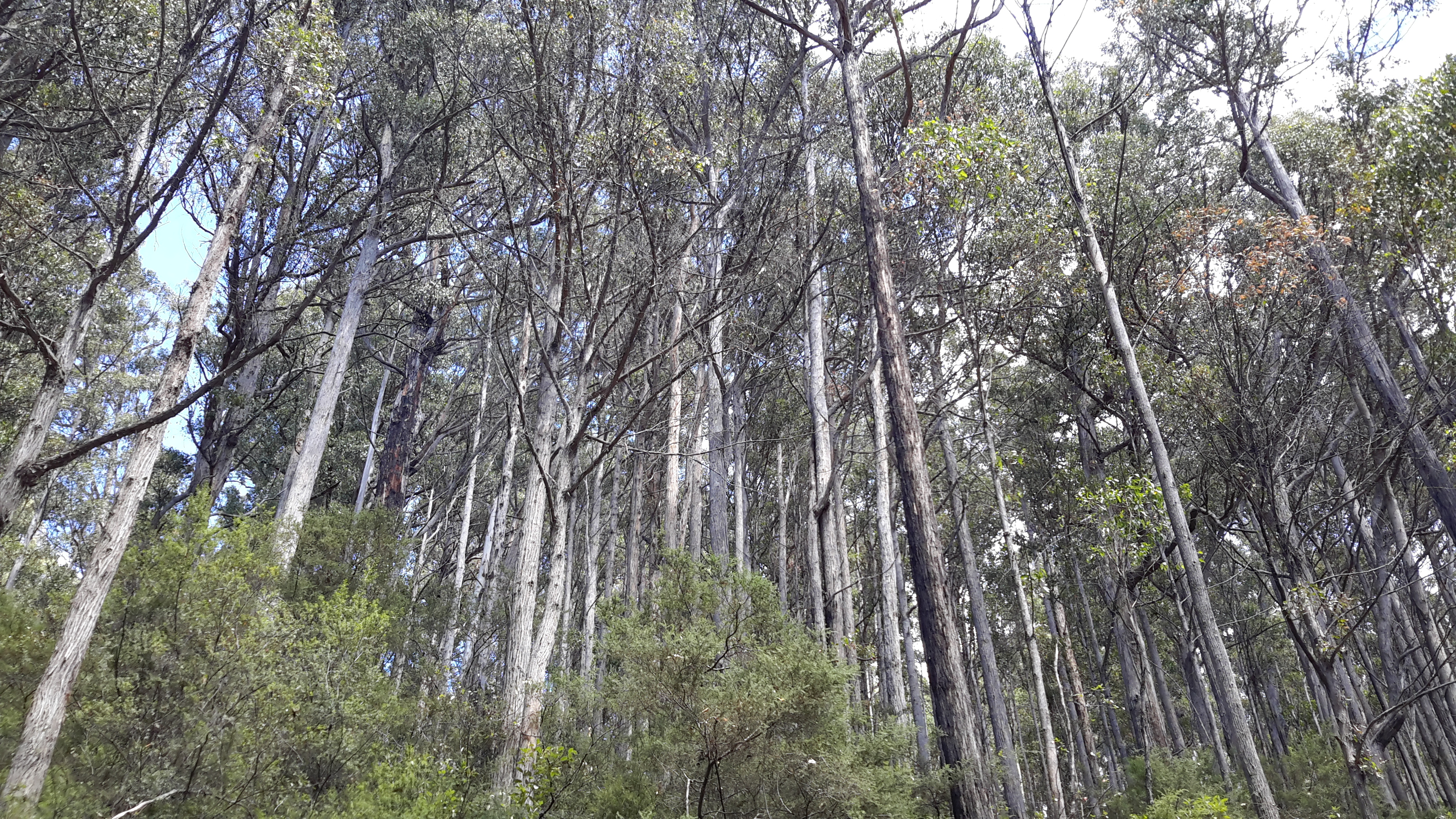 Andrew crossed, looked downhill and saw nothing but dense scrub ahead. He remembers remarking out loud “don’t dither, just do it. Don’t delay. Here we go; just do it”. At 10.10 am he left the Canal. Before stepping into the unknown, he spent time getting a GPS position fix and a magnetic bearing. Once set, he plunged into the thicket and took a series of sightings from one key tree to the next. This allowed him to stay on his bearing, and meant he would be able to retrace his steps if the going was too tough and the forest impossibly dense. The route down the steep slope passed massive tree ferns, smaller ferns, myrtles, mature eucalypts and the occasional Sassafras tree. Many fallen trees littered the understorey and it was clear this was an old forest in a constant state of regeneration. Scrambling over or under logs and negotiating rocky bluffs was a normal part of the descent.