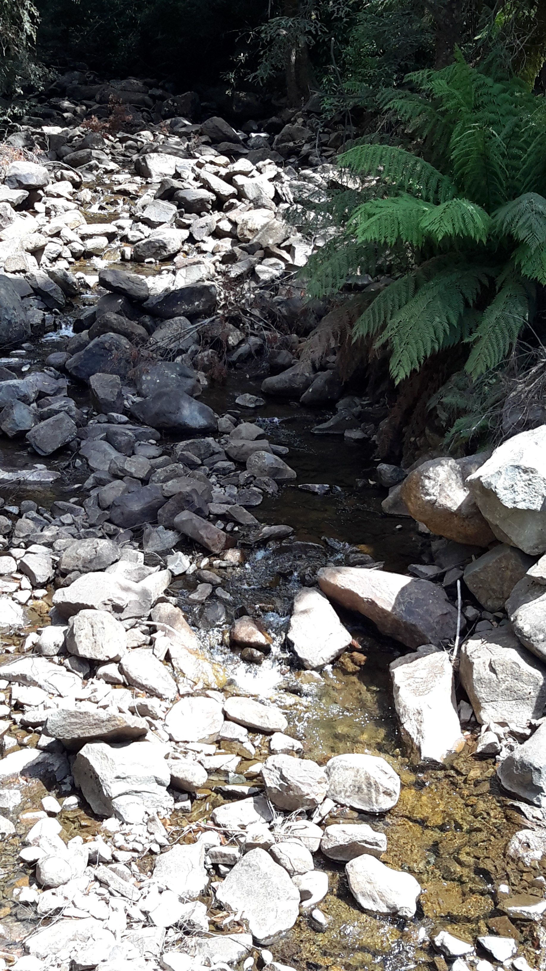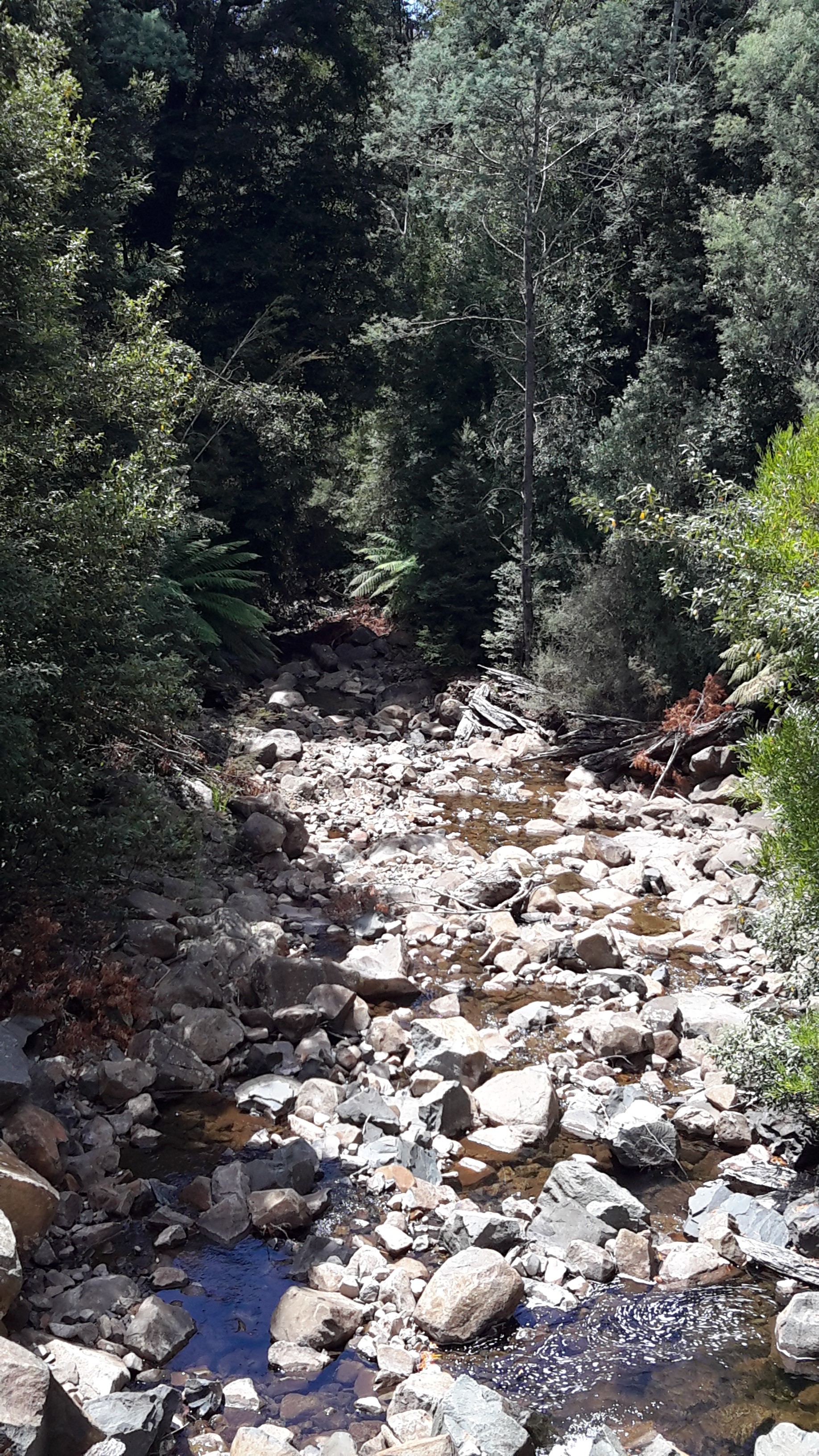 Half way down the steep incline, it seemed that serious wind was blowing high up in the trees. Before long it was clear the rushing sound was the water of the Derwent River further below. Once the river could be seen, then it was a comparatively simple process to choose the clearest path to the river bed.