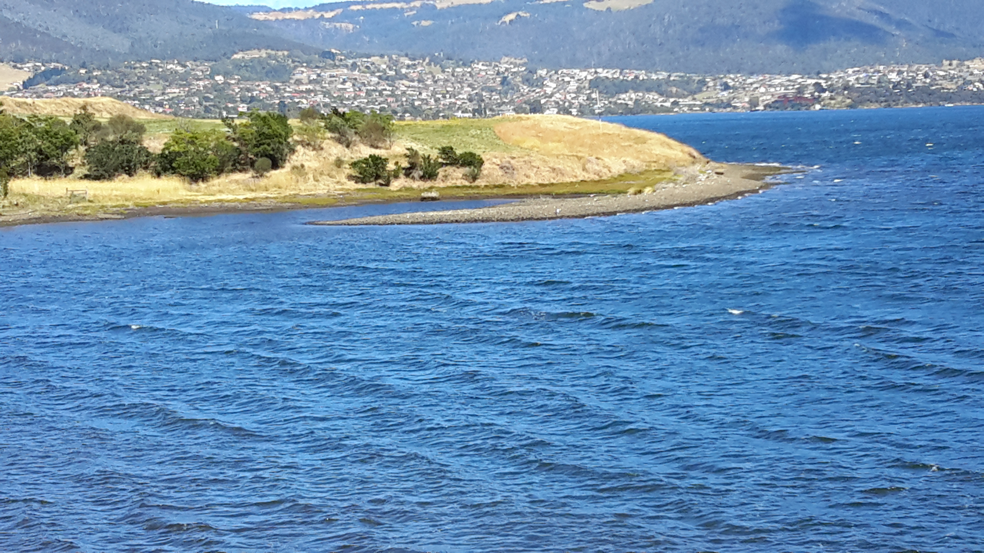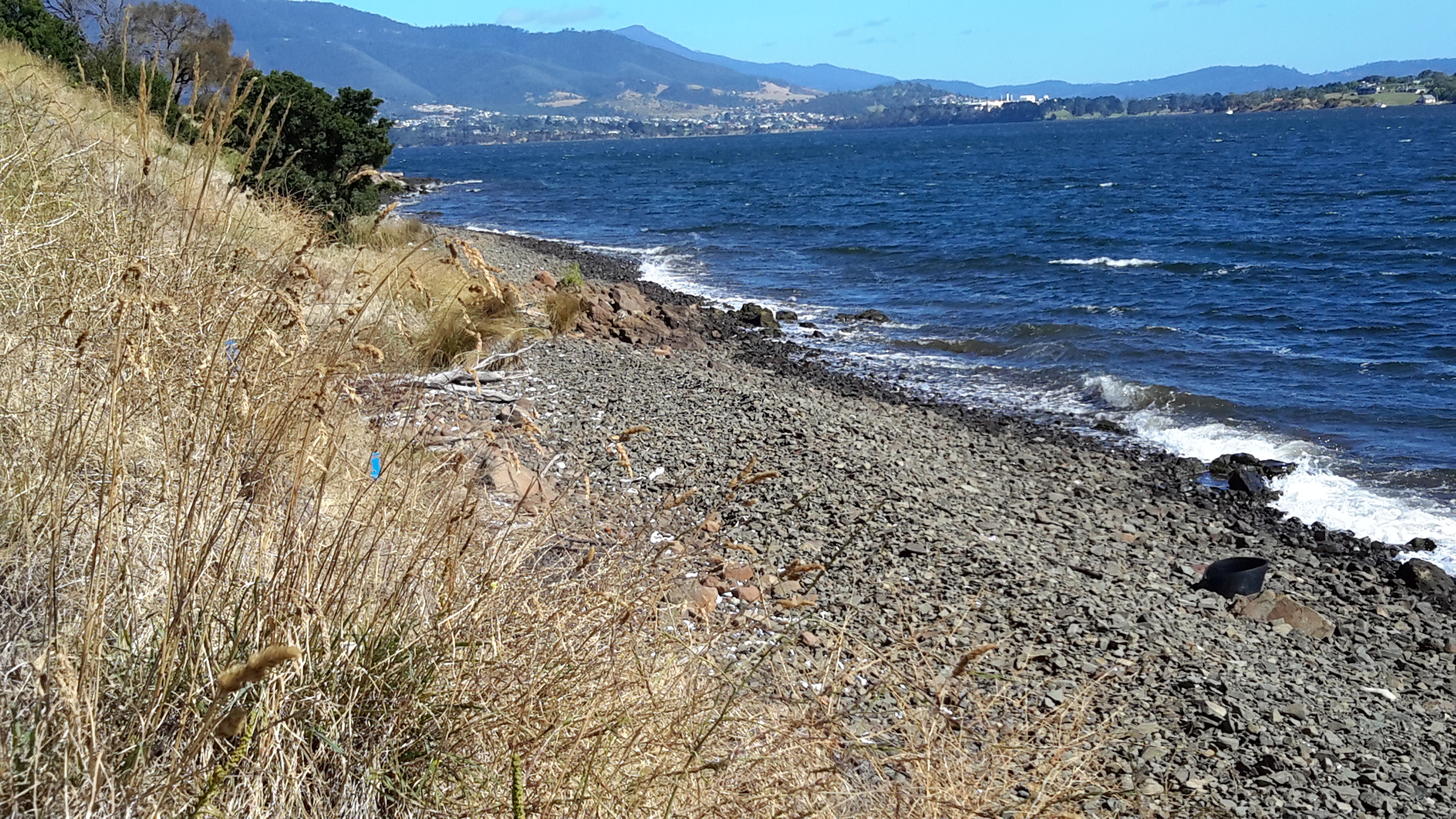 I was delighted when I came across a slight semblance of a track down to the river’s edge. Soon I was on the shore and walking that rocky ‘beach’. The wind was fierce but not cold. My sunhat had no chance of staying attached to my head. I lathered on the sunscreen hoping for wind protection. But it was fresh and invigorating. The air was alive and so I felt even more alive. And so pleased that my return visit to Dowsing Point had been able to bring me down to the water of the Derwent River.