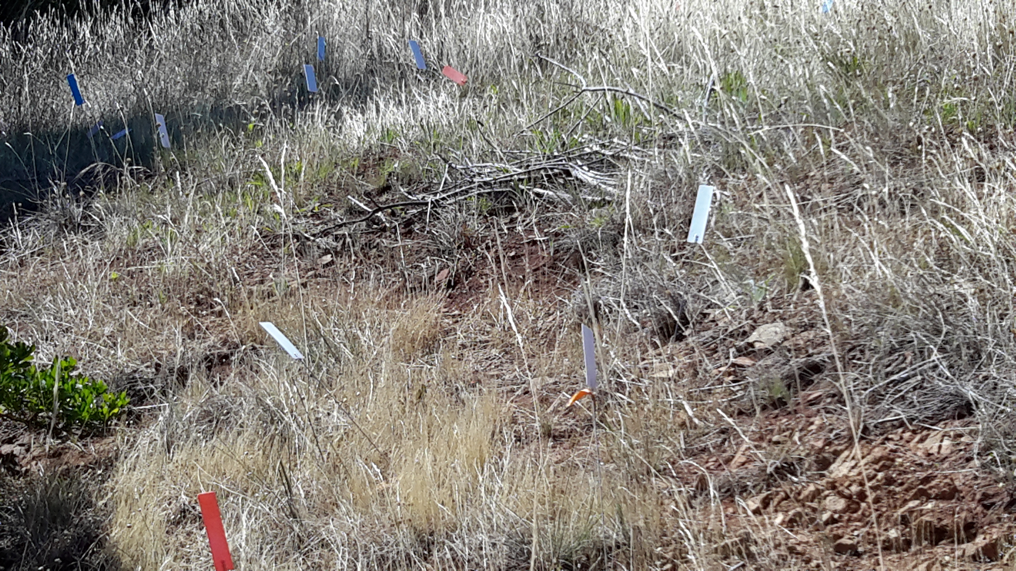 Occasionally, next to the faint track through the grass, someone had placed track markers – coloured rectangles on posts. Very thoughtful. On the way back I found a wonderful confusion of markers; just as we know some mailbox catalogue deliverers dump a pile of undelivered catalogues in drains or over someone’s fence, it seemed the person placing the track markers dumped his/her extras. So there I was, faced with an amusing mini-forest of markers all pointing nowhere and signifying nothing.