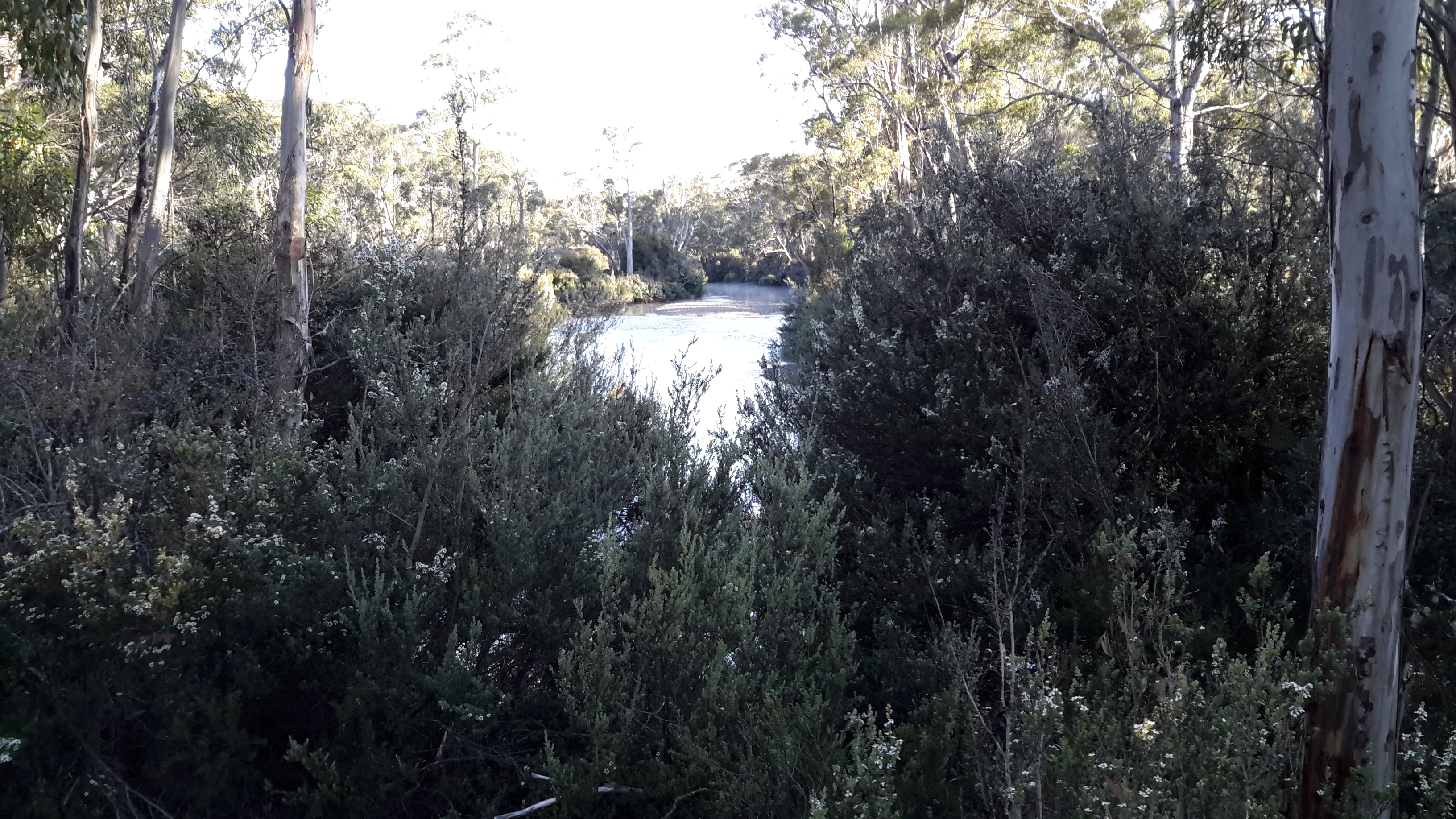 While Michelle’s photo below taken during a flight along the Derwent River shows the vegetation between the Canal and the River bed, the location is further along towards Clark Dam. Nevertheless it does show the density of the bush which needed to be penetrated and walked through.