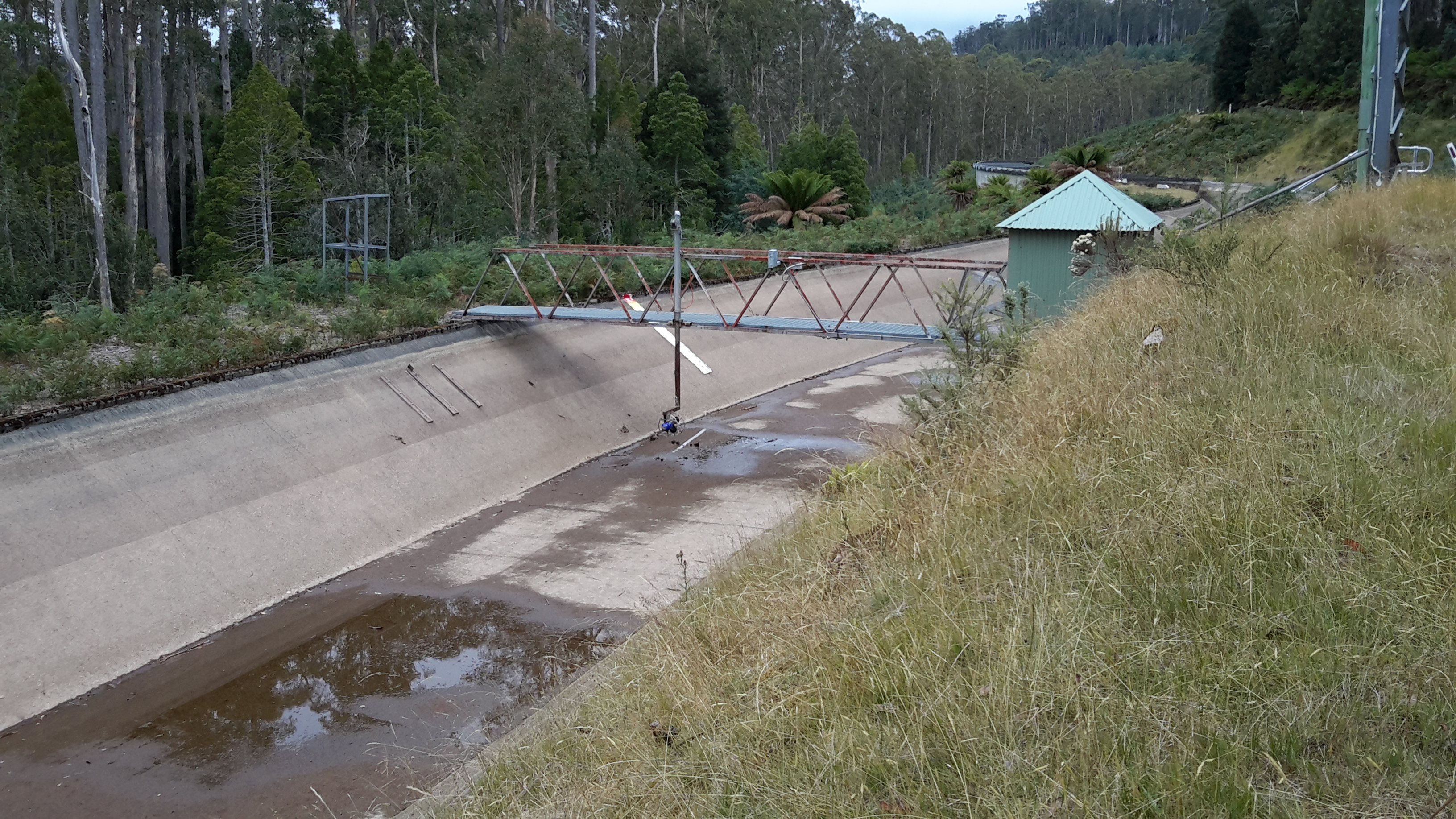 I believed I had two options; one was to walk along the plush mossy flat Canal verge until I could spot a ‘gap’ and then plunge into the thicket. The second option was to walk on the track beside the Canal until I reached the first Hydro Tasmania crossing located about a kilometre westwards along the track, cross over, and hope there was some sort of clearing through the bush down to the bottom of the hill. If not, then I would have to make my own way until I reached the Derwent River bed. The first crossing, in the photo below, shows no sign of tracks extending further.