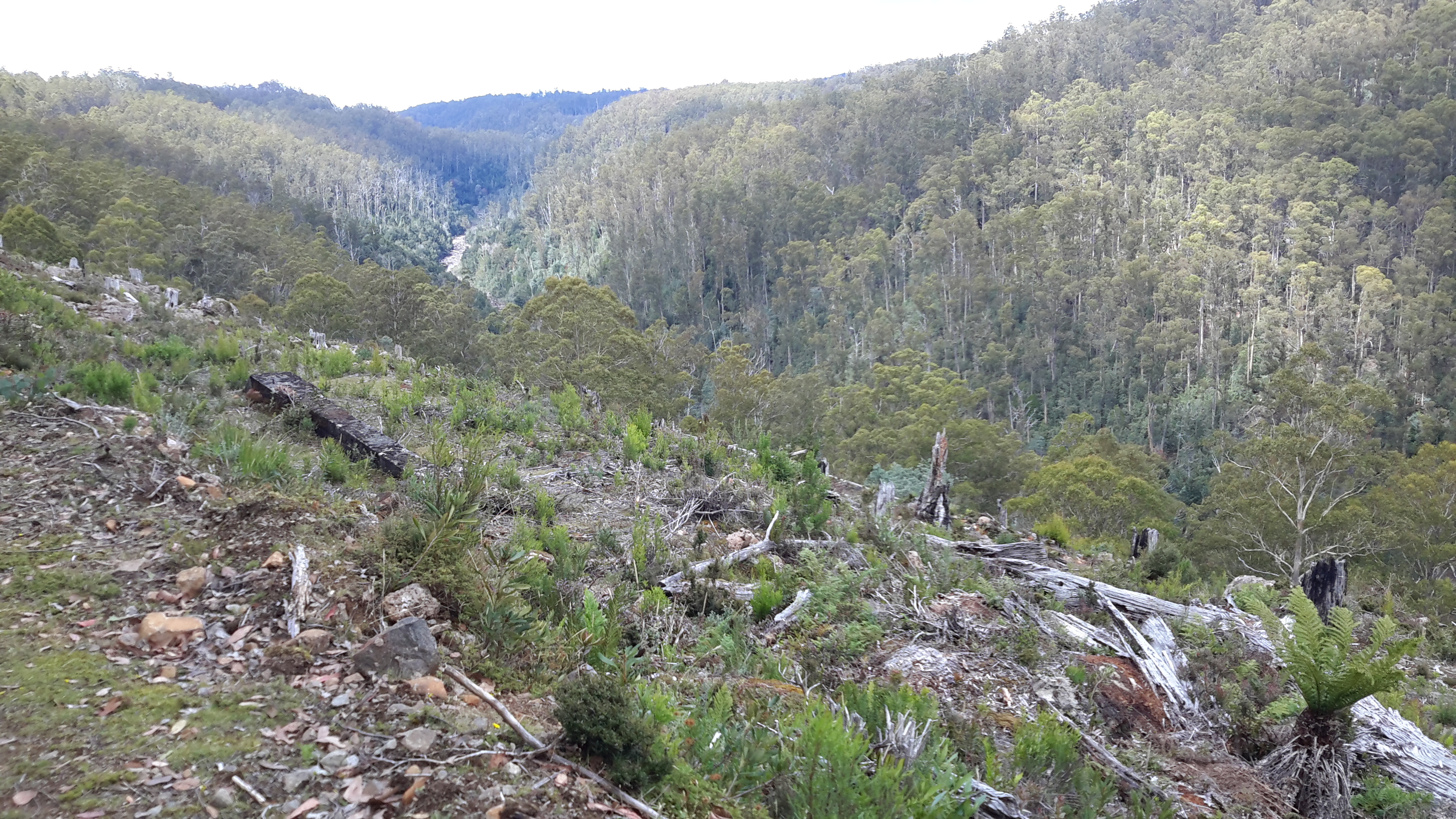 From that crossing down to the river, I anticipated the distance would be approximately one and a quarter kilometres on a slope that dropped around 210 metres. Unless I was fortunate to find a clearing that Hydro Tasmania had made, something like the following example spotted closer to Clark Dam, I expected to be in for a hard time.