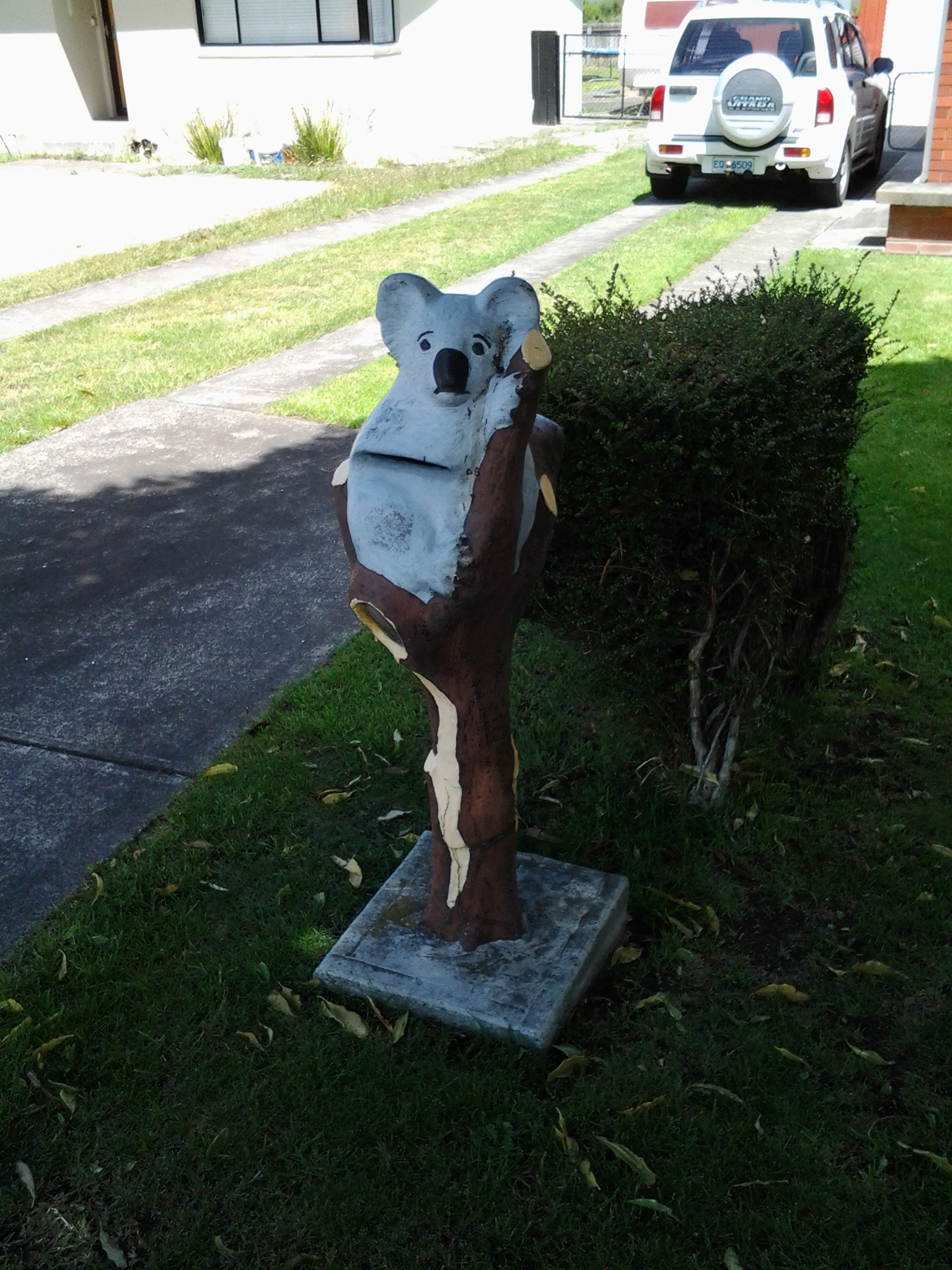 A poor sad concrete koala (maybe commiserating with the live koalas in Brisbane given to G20 leaders for a cuddle)! The postman would push his letters into a slit in the koala’s stomach.