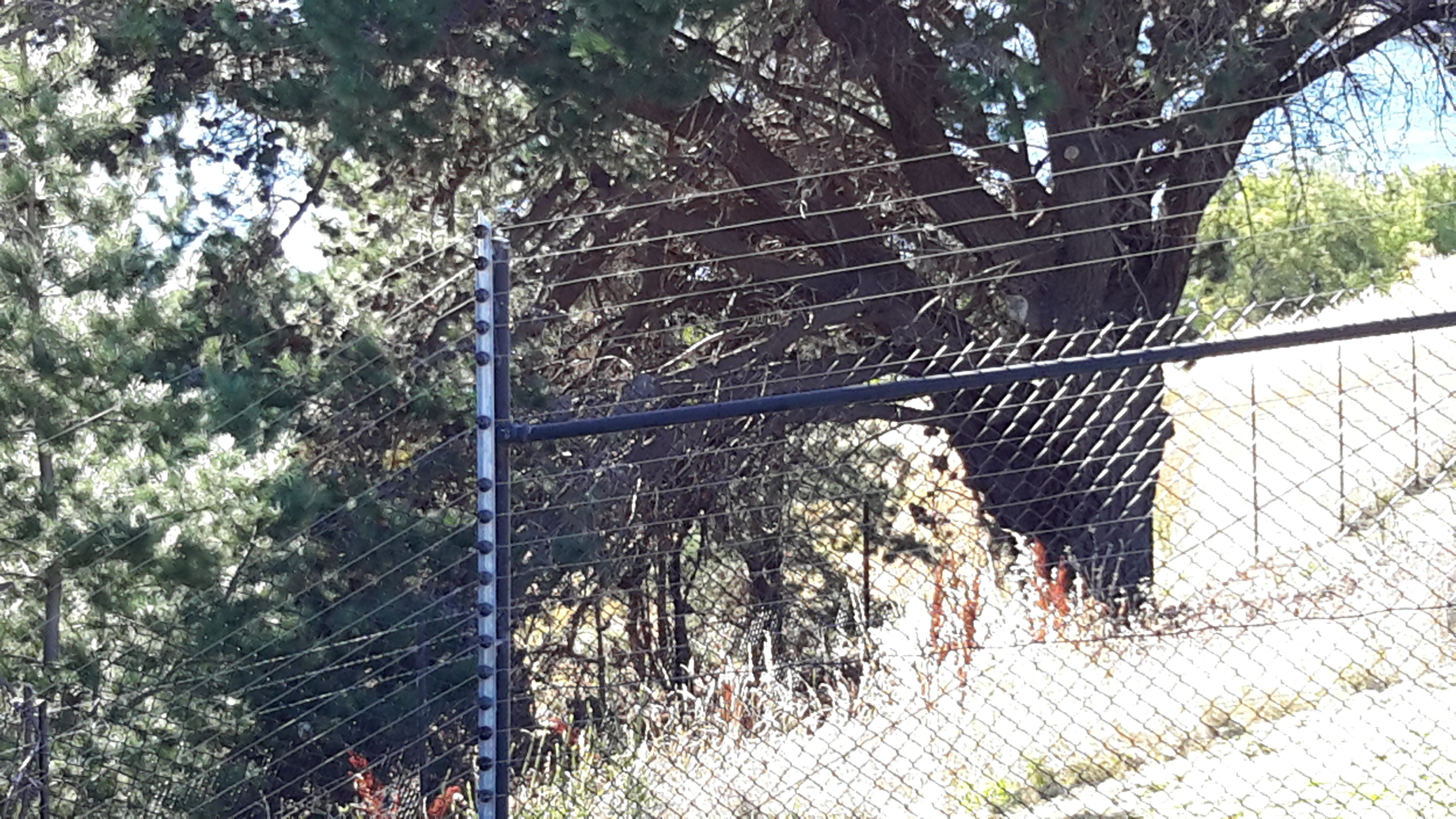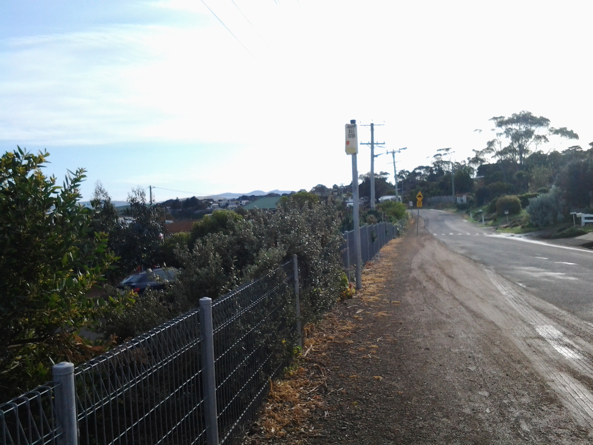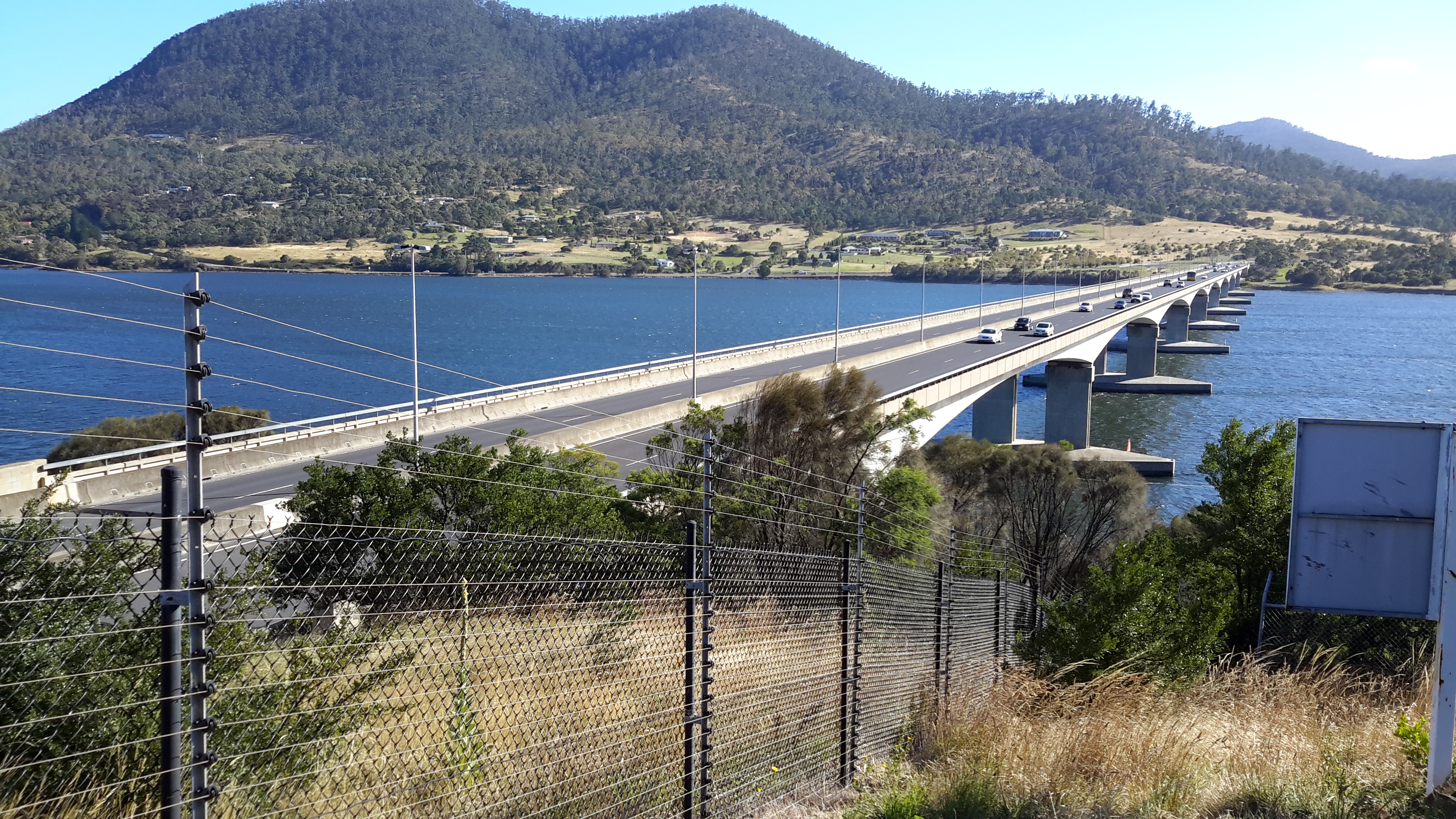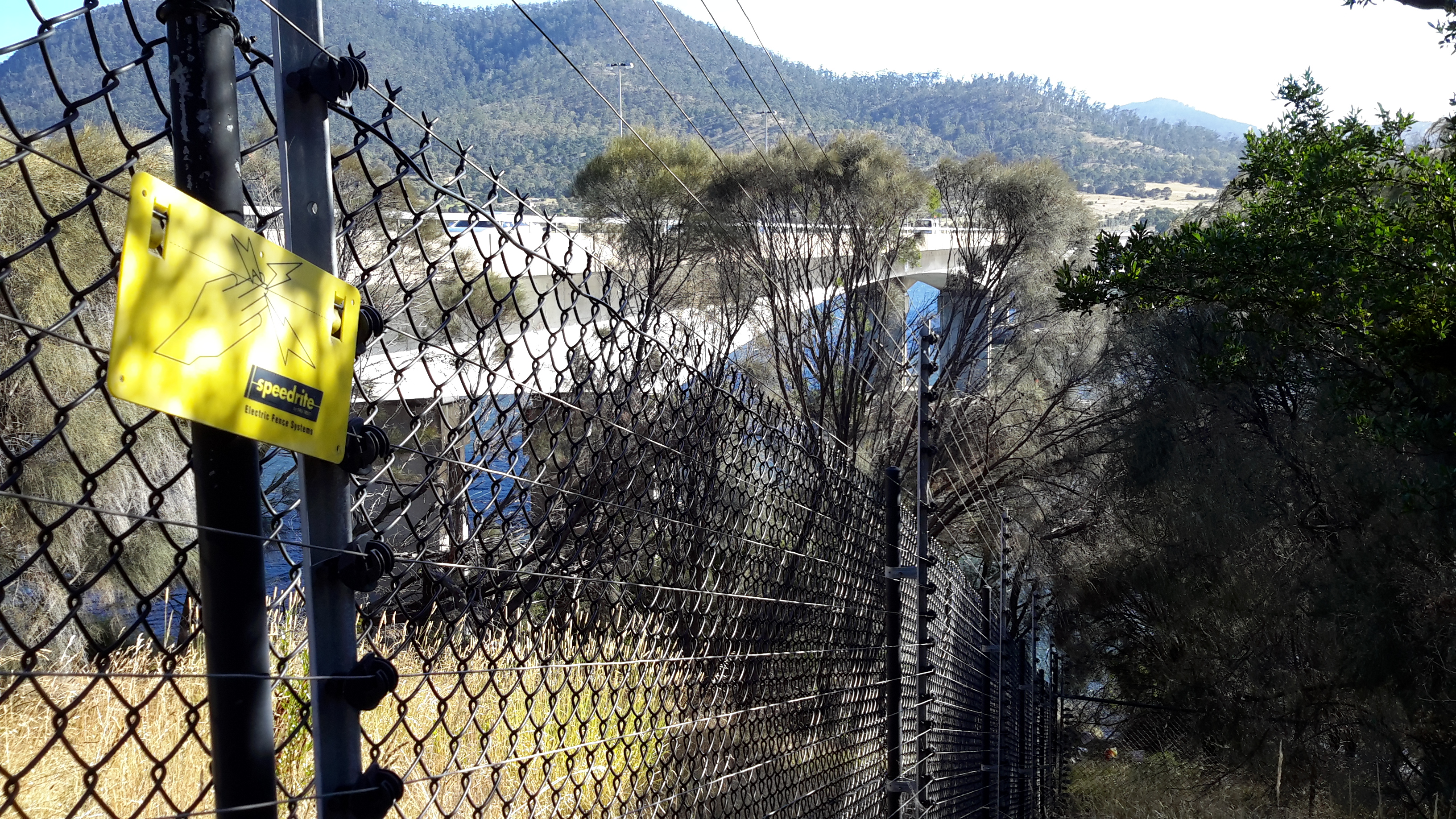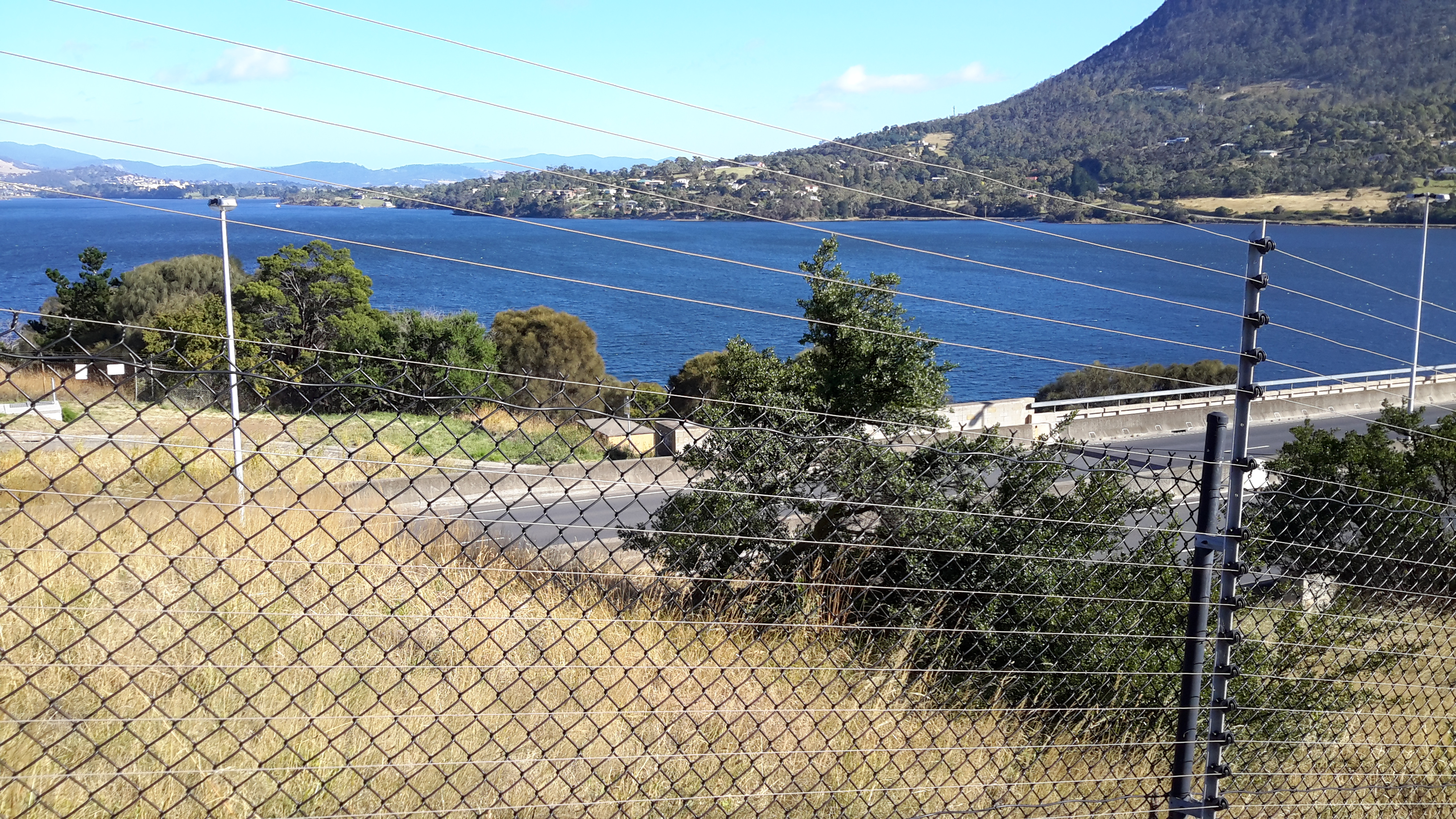 By leaving the bus at the turning circle within Technopark I hoped there might be ways to walk to the river edge and then continue around Dowsing Point. Until I looked around that day, I had not realised this precinct is seriously fenced, including the installation of electric fencing, and there is no exit except through the main fortified entrance gates. In the photo below you can see three layers of fencing, with barbed wire strung up at the top of the closer two fence lines- and the Bowen Bridge across the Derwent River in the distance.
