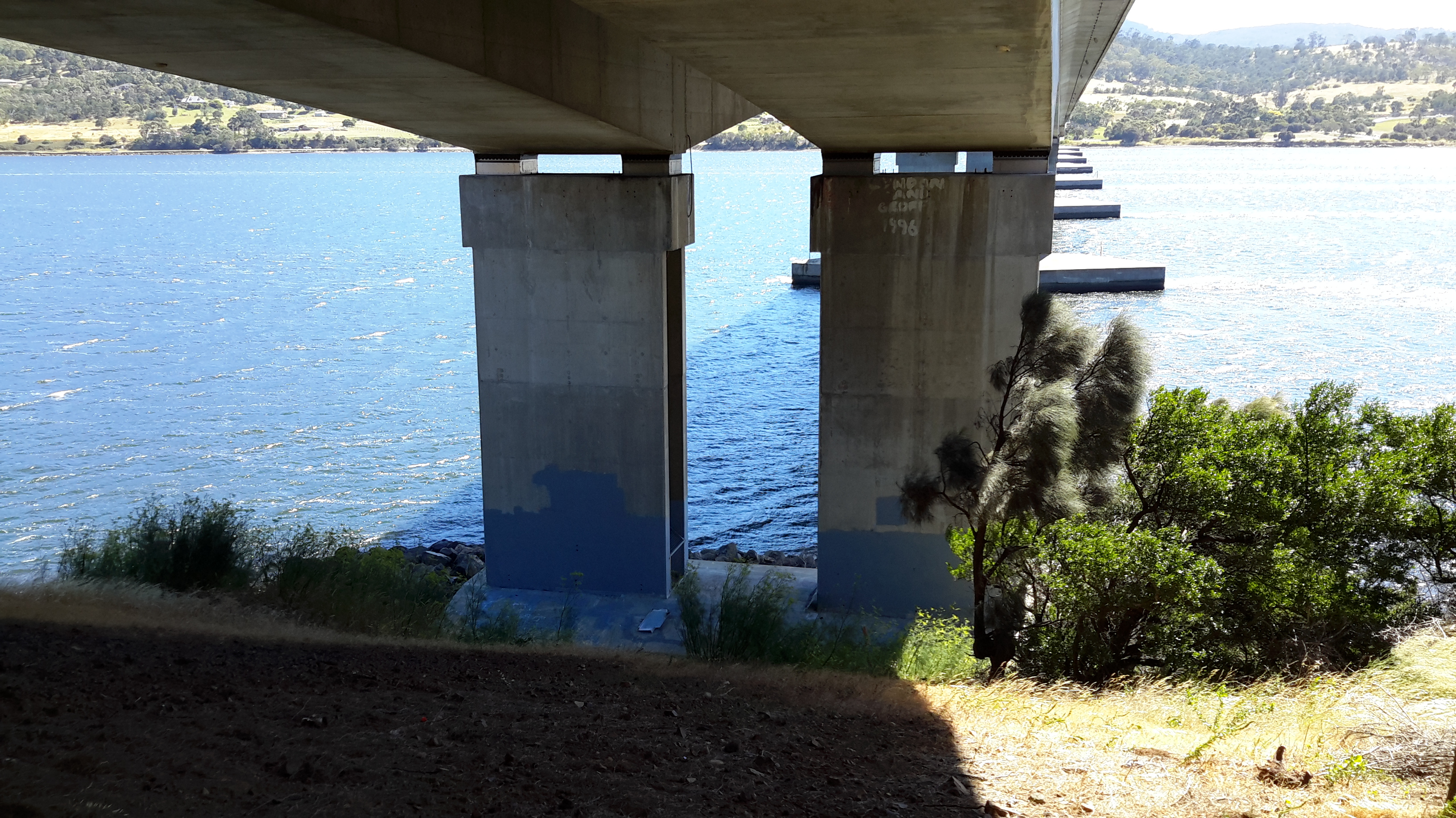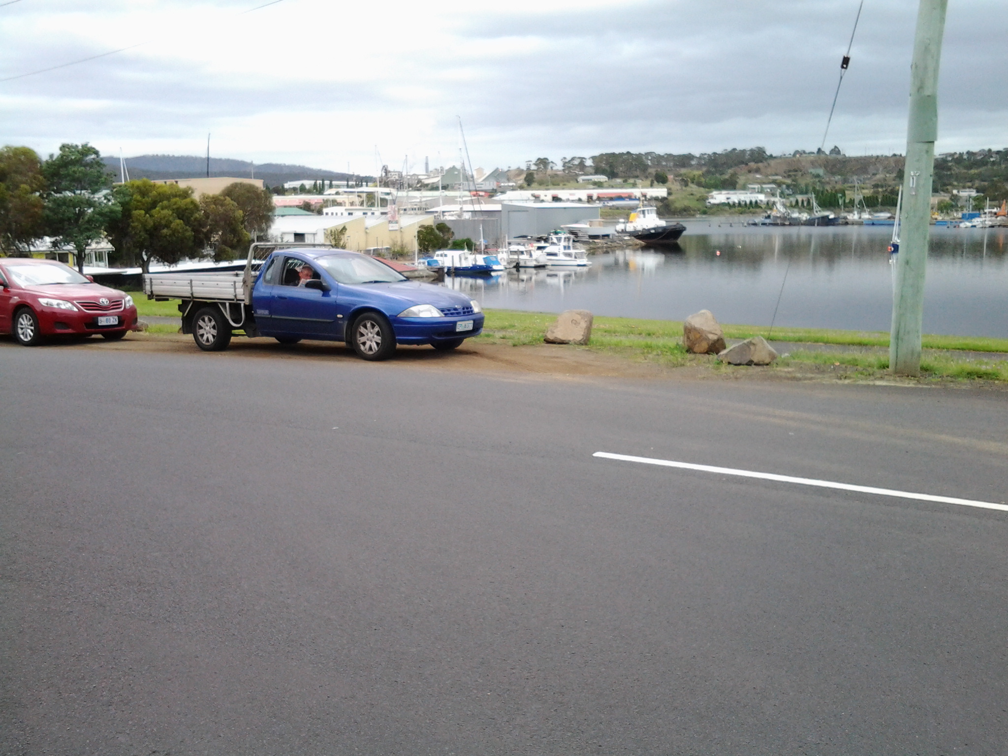 Firstly I turned left into Negara Crescent which was a street combining mean, low level, paint-flaking, unmown lawns, weed infested residential properties (okay – well not all were, but many were) with light industry such as Linen Services Tasmania, boat works, Anchor Wet Suits, Towbar and Crash bar repairs, fishing supplies, and a large unnamed workshop building emitting unpleasant chemical smells. Those houses which had Derwent River frontage sometimes had escaped overgrown blackberry infestations blocking river access in their back yards. There wasn’t a sense of wanting to live caringly or beautifully here. Accessing the River is impossible without entering private land around this locality. The built-in nature of some parts can be seen on the sign for a block of land that has been sold.