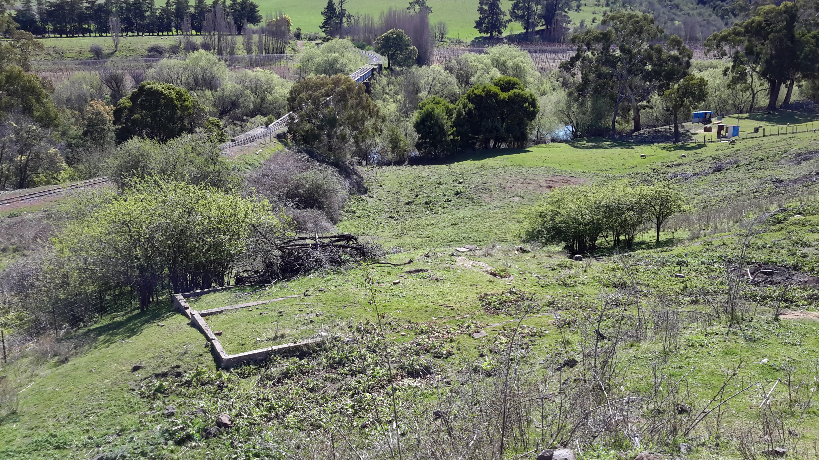 The railway line sleepers over the Plenty River were rotten and impossible to walk over safely, so I exited to the main road, crossed the road bridge and then, through the row of trees on the right in the following photo, I entered a new paddock covered in fruit trees.