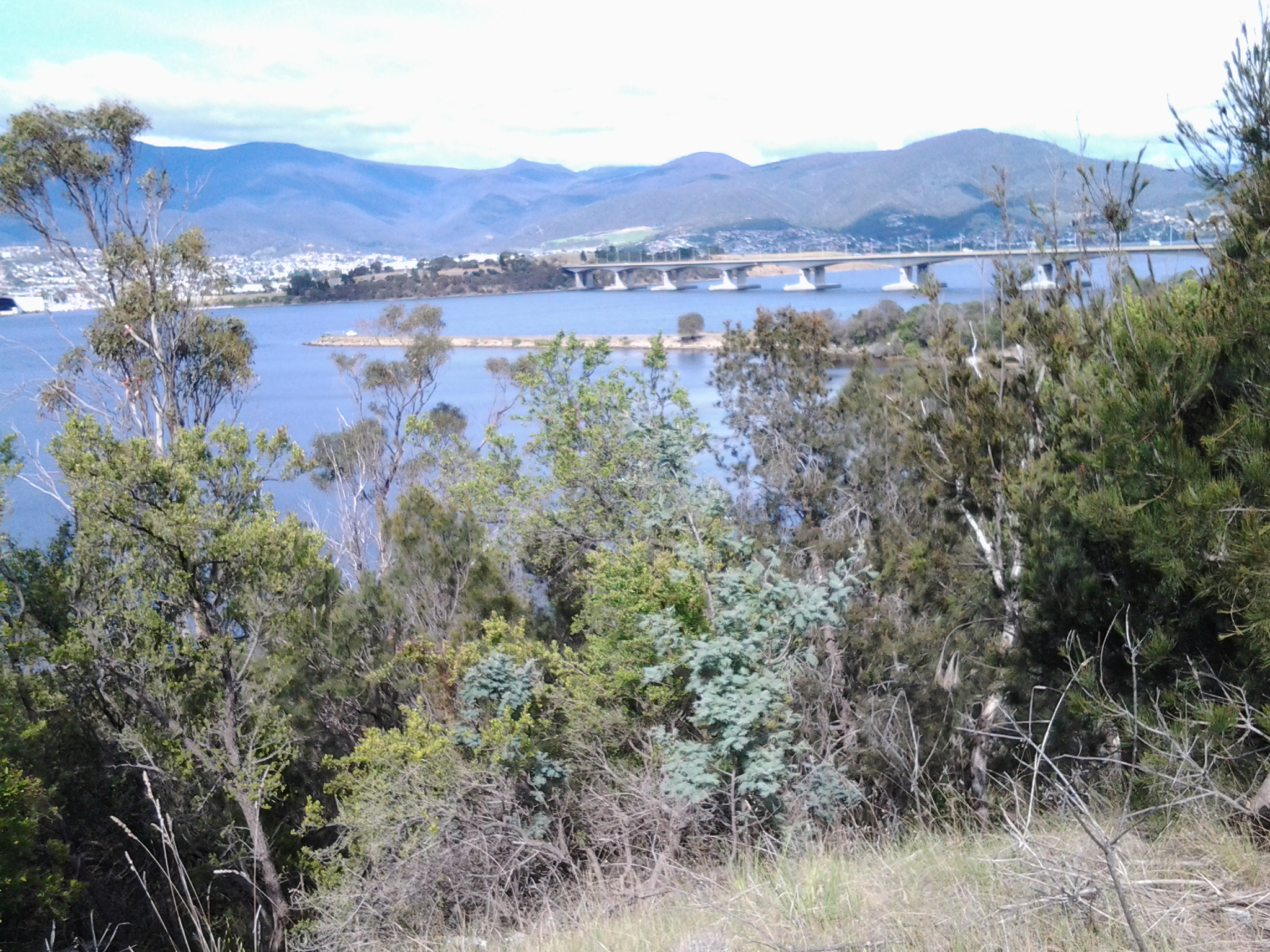 The photo below shows the Cleburne Spit which inserts itself into the Derwent River, with the Bowen Bridge crossing the River in the distance.