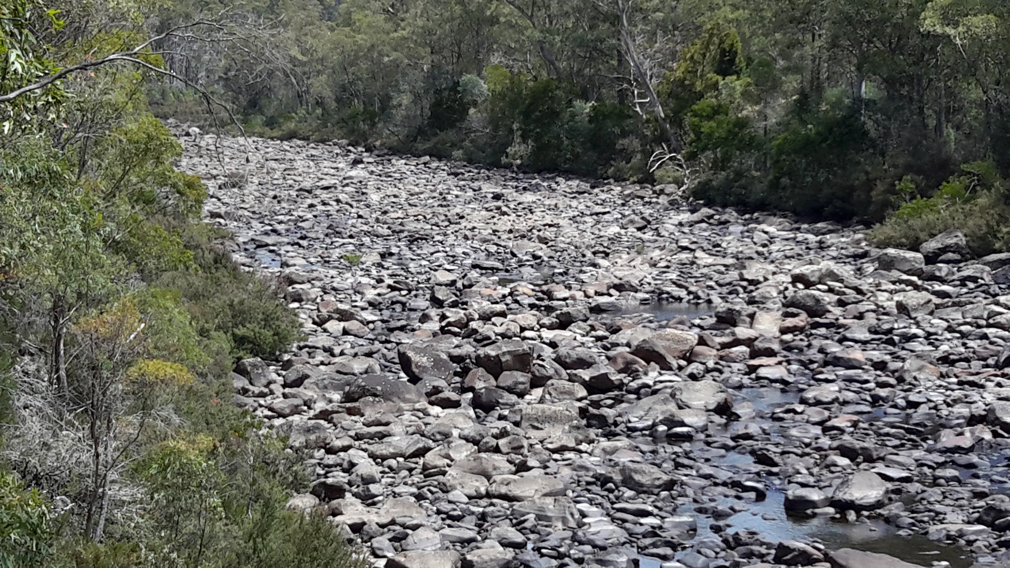 A thesis by Anna Do offers ‘SALTAS currently operates two hatcheries: Wayatinah hatchery on the Derwent River and the nearby Florentine hatchery‘. When I walked on the north/eastern side of the river upstream from the Wayatinah Power Station last year I could not identify the buildings near the confluence of the Florentine with the Derwent River. Now I understand that I was looking at the second hatchery. In this thesis on page 8, an aerial photo of the Wayatinah hatchery shows the Derwent River with considerably more water flowing that exists today. Refer to my photos of a stony river bed earlier in this post.