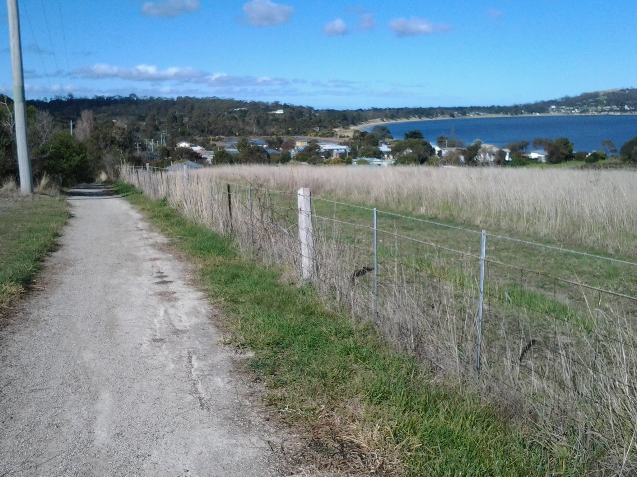 I used the gravel bicycle and walking track next to the main road which extended from the beach end of South Arm beach to Opossum Bay Store, with a bus stop opposite. This is where I finished my walk.