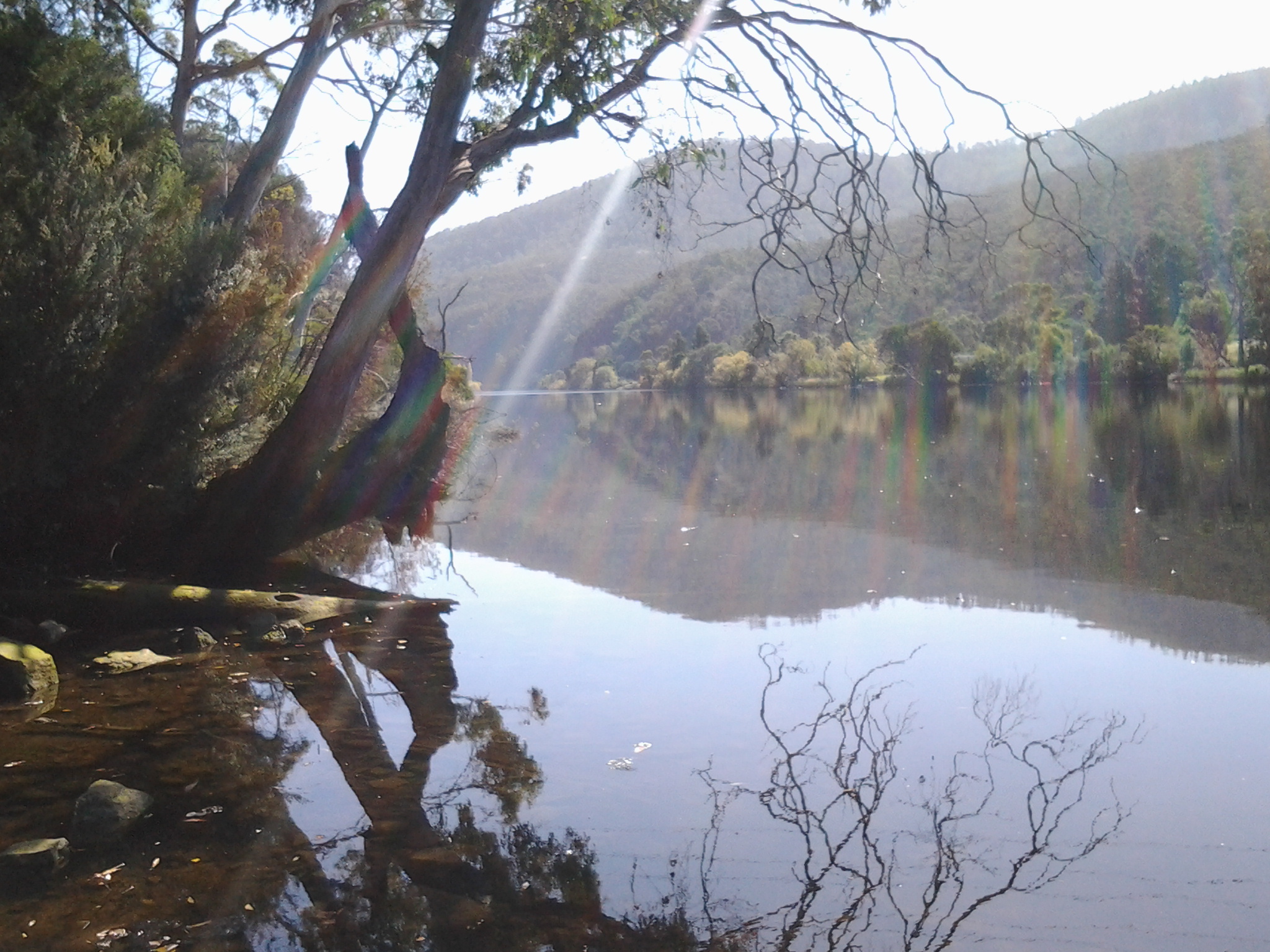My walking pathway along the scenic edge of the Derwent River on Stage 14, passed between the New Norfolk Caravan Park and the glistening river water, so I continued unhindered to amble amidst the glow of autumn gold leaves.
