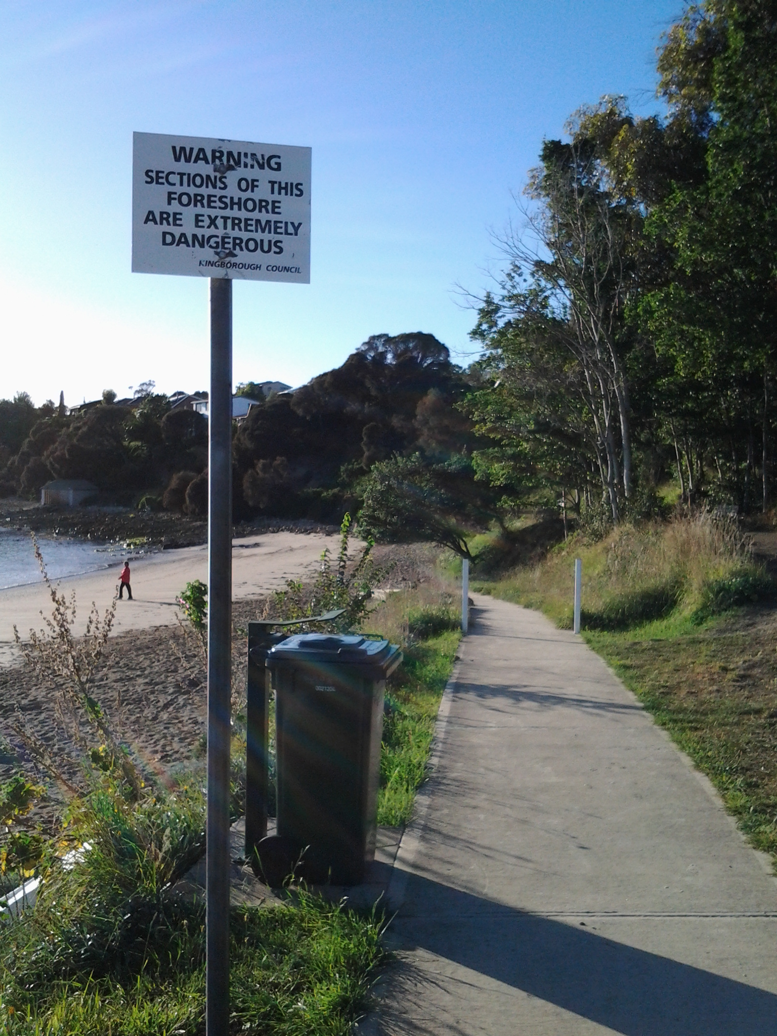 As I turned left from Wells Parade into Hazell St towards the Blackmans Bay Beach, a screech of Sulphur-Crested Cockatoos circled overhead. I was on the beach at 7.45am. The water was calm and I looked over the Derwent River towards South Arm beach on the eastern shore.  The Iron Pot lighthouse on the rocky outcrop just offshore from Cape Direction, on the southern tip of the South Arm peninsula, seemed to stand up from the water like a fat thumb.  Back at Blackmans Bay Beach, the fresh sunny morning was complete with power walkers and dogs leading their owners on a walk. Public toilets are located half way along the Blackmans Bay Beach.  These are the last public toilets for anyone walking further south.