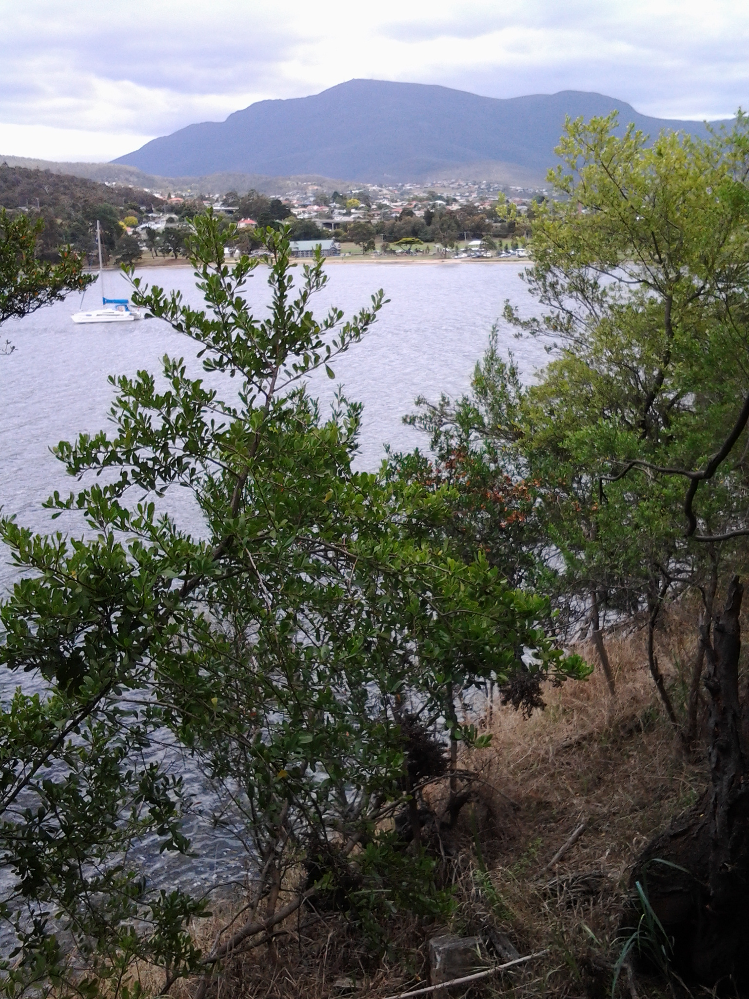 Not to be defeated, I retraced my steps down the original pathway until I discerned an old disused track that seemed to continue along the Cliffs. I walked it but casual inexperienced walkers and those walking alone absolutely should not. Incredibly unsafe in just about every way. I didn’t fall nor receive injuries but there were so many ways and places I could have damaged or killed myself on that route. I won’t relay all the details of that walk except to say that the views across the Derwent River though the trees were grand. Blue Wrens darted around me through the bush. Waves pounded against the Cliffs, and I could hear the roar of waves crashing on distant beaches. Because photographs flatten the vistas, the ones I have taken do not present the feeling of isolation, steepness nor roughness of this non-track. But it was incredibly beautiful and I am glad to have seen that landscape.