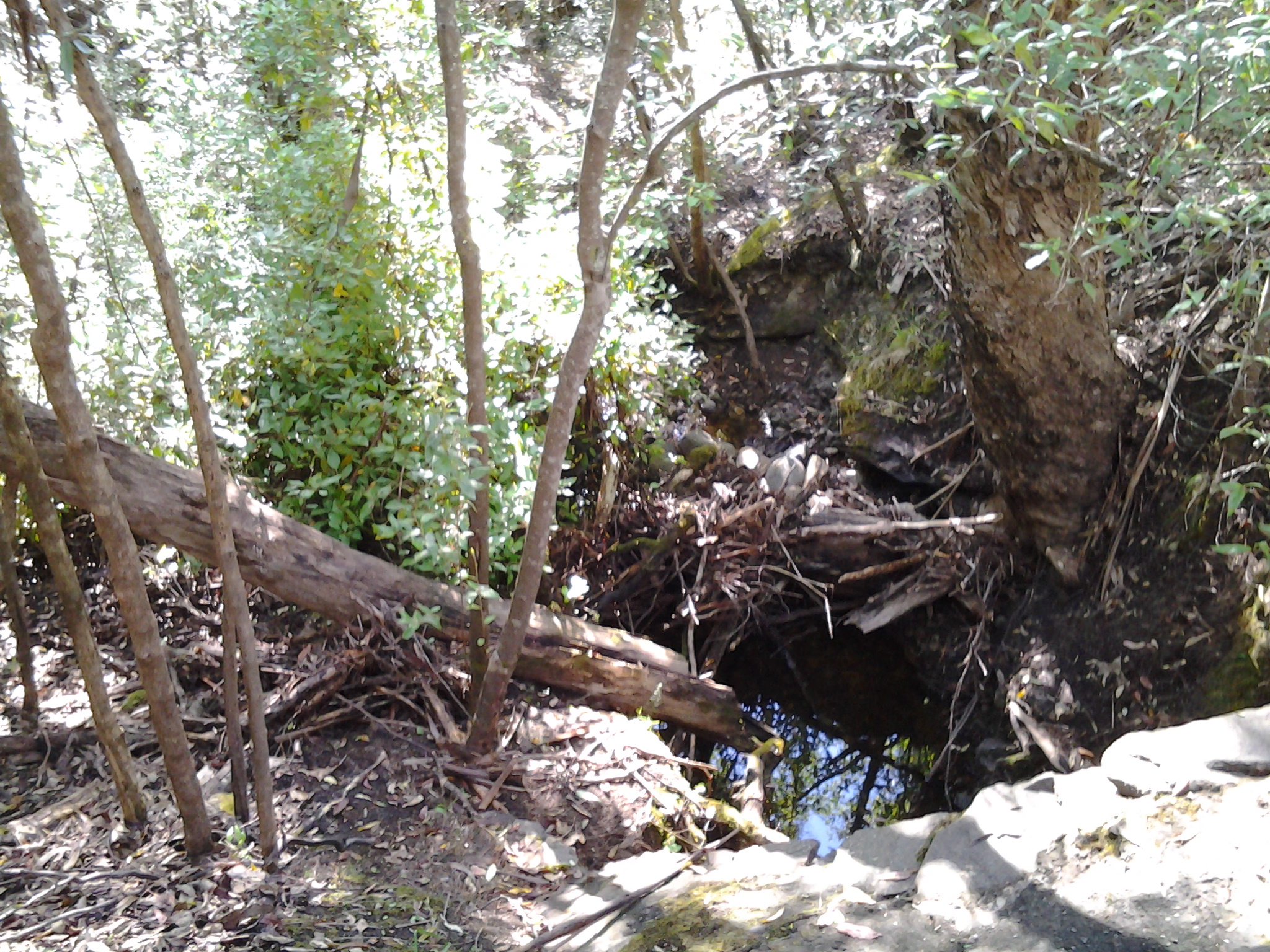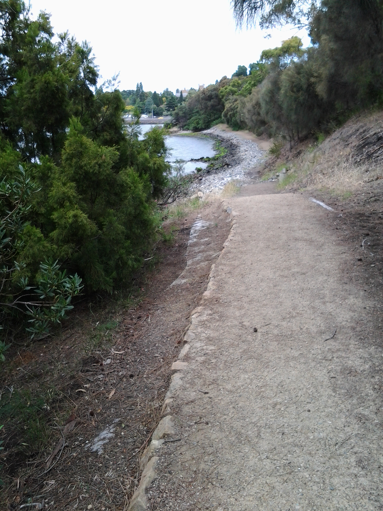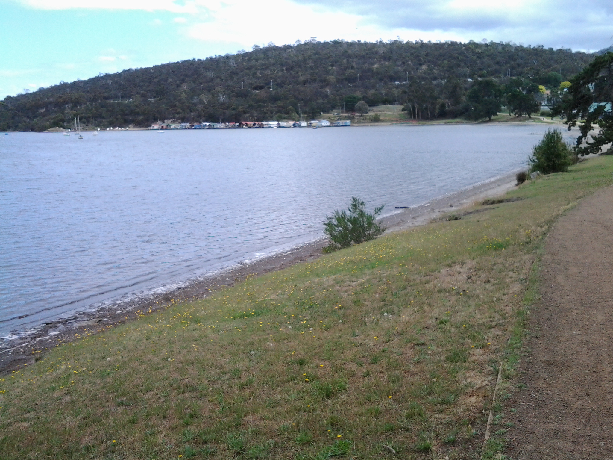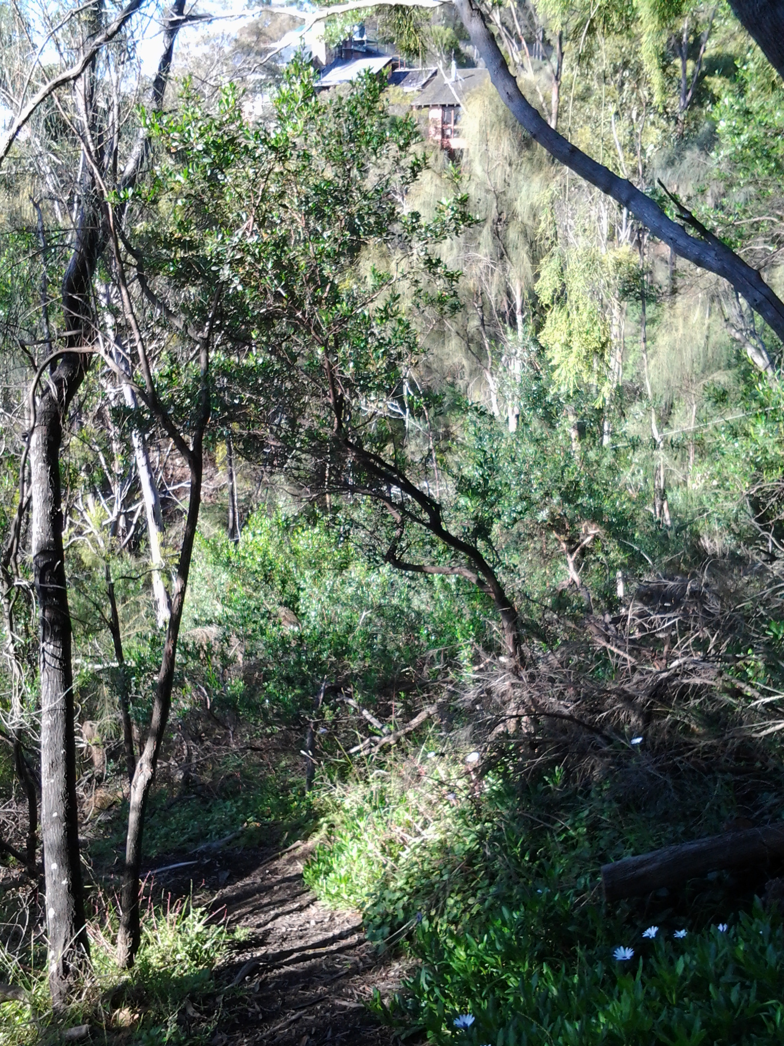 I started this diversion at 8.37am. After following a collapsing path (although parts were good), I managed a deep descent into and an ascent out of an unnamed gully by 9.12am, rounded an extensive private house, talked with the house owner about the future of tracks along the Alum Cliffs and the non-availability of any tracks passing his house (which stood on the very edge of the Cliff) around 9.25am, and walked down and around the very long winding private driveway over a trickling creek, I reached suburbia again at 9.35am – the same point on Wandella Ave I had been earlier in the morning. I had completed a loop. Certainly I had been close to the Derwent River more than most but I had not advanced along the River.