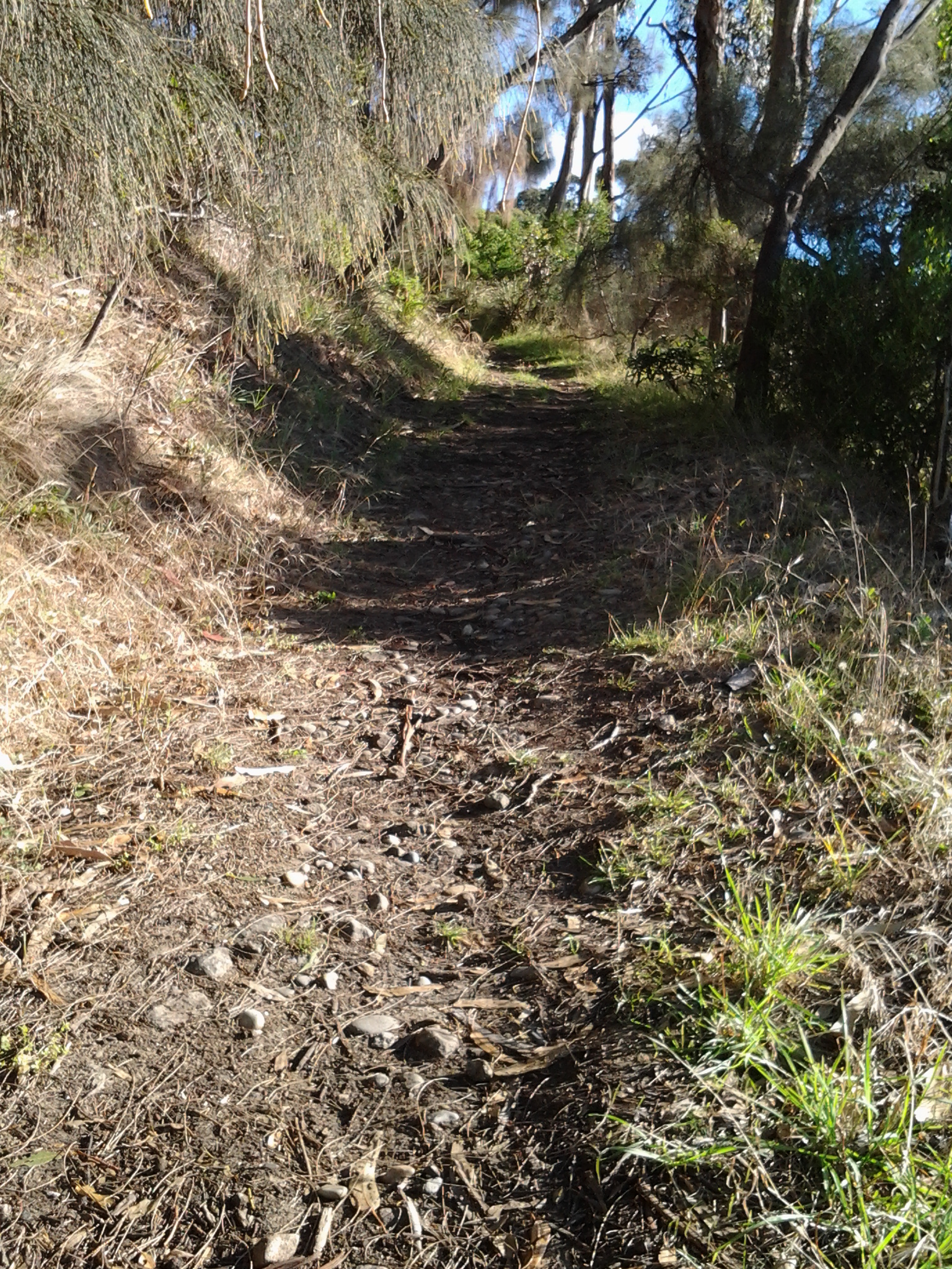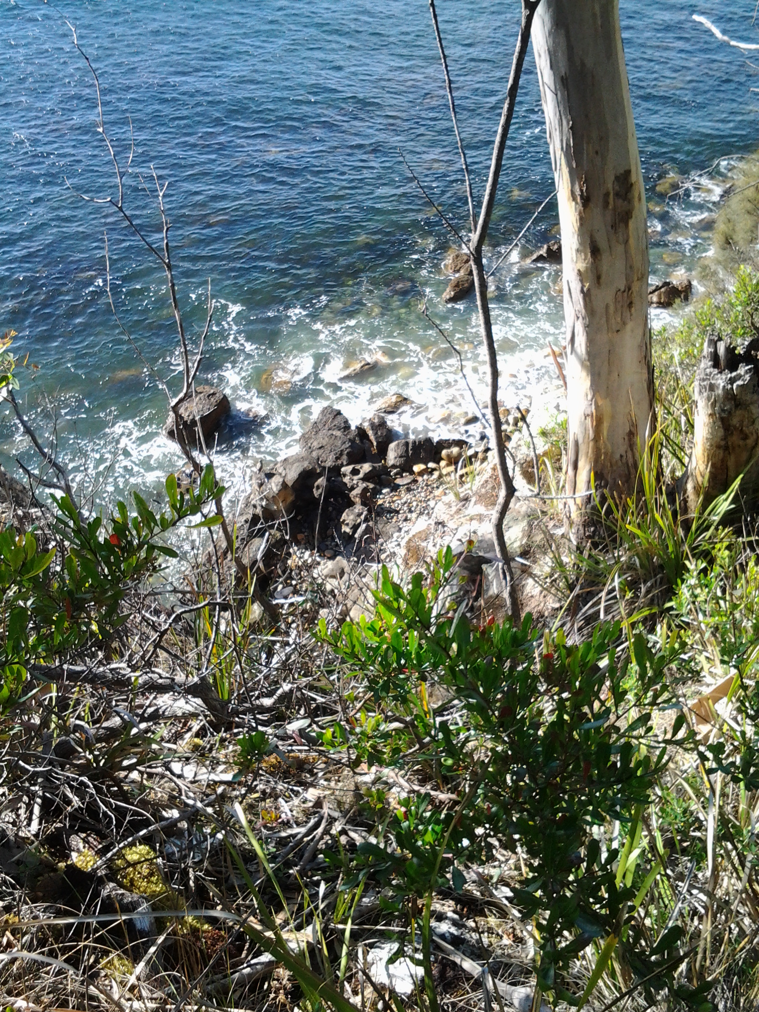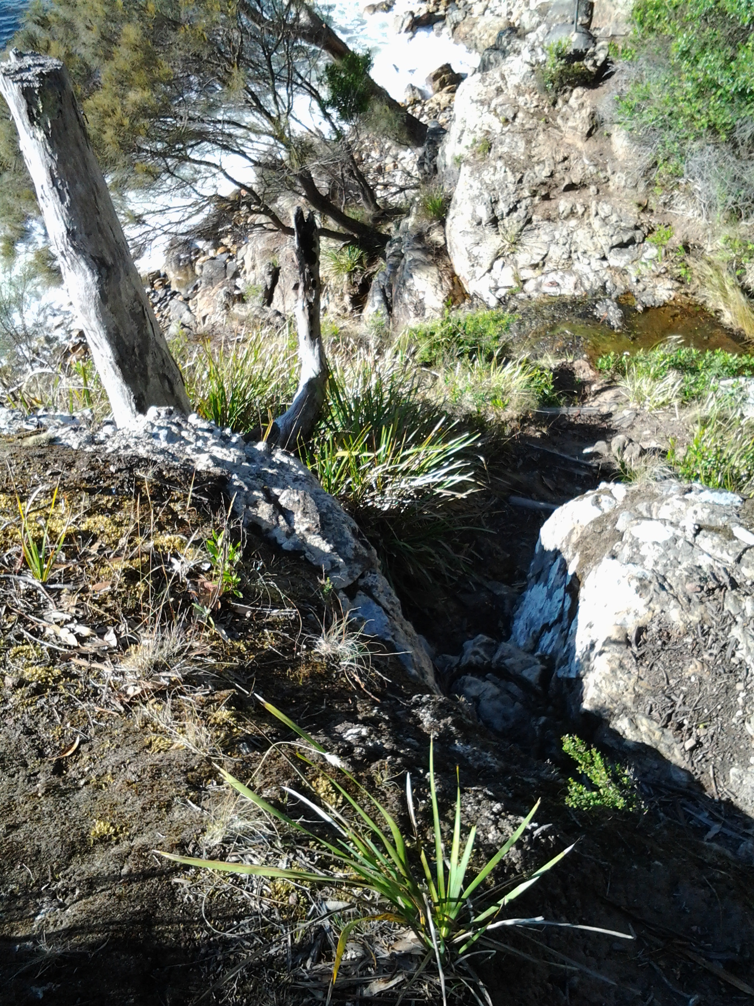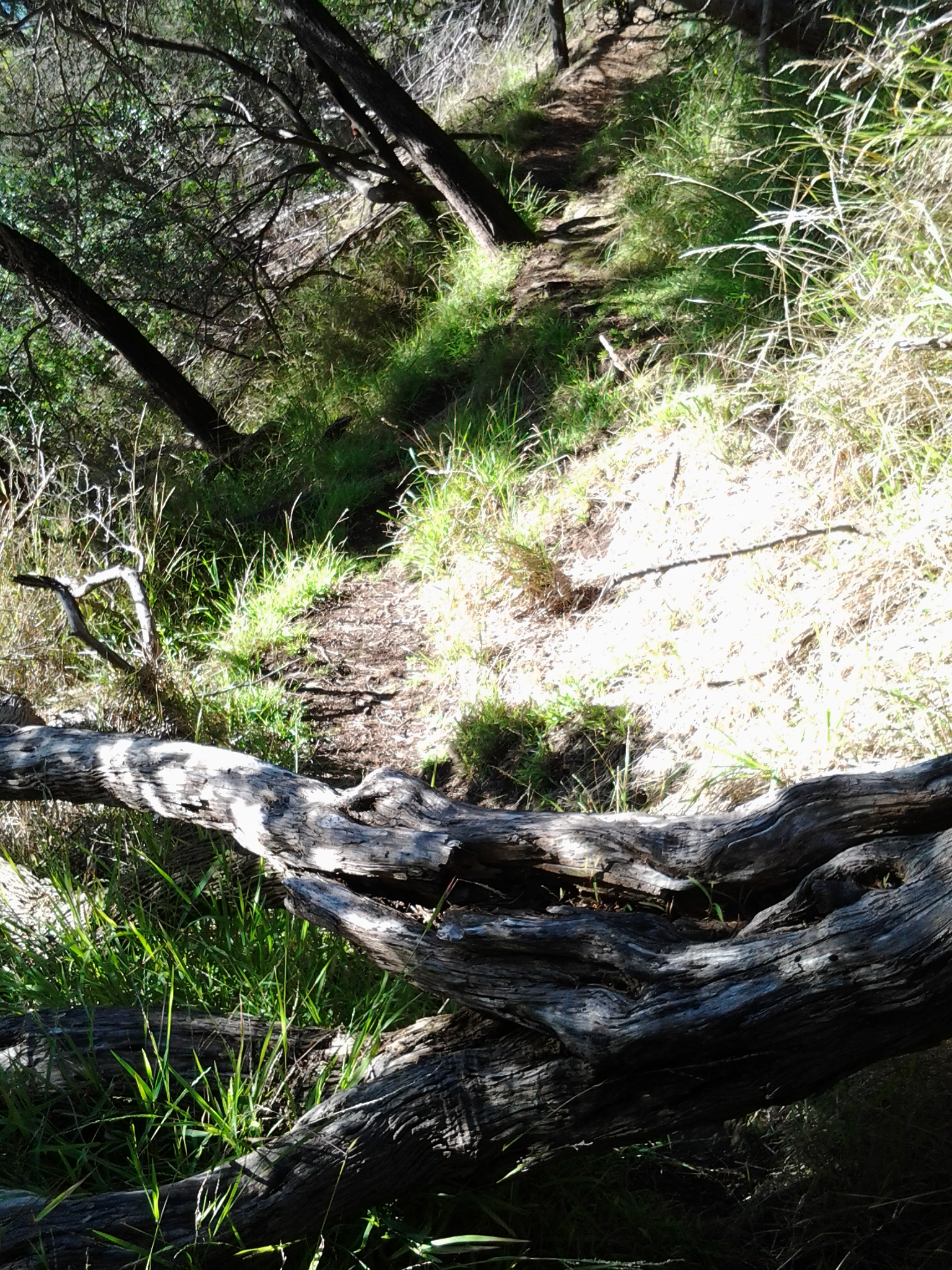 Very soon I arrived at a gully with a small trickle of water passing downhill. I chose not to cross by balancing as a gymnast on the dead tree trunks that criss-crossed it. Instead I simply walked easily down, stepped across a few rocks and walked up the other side. Before long it was clear I was fenced in and that a proper dirt track passed on the other side of the fence. The fence was elastic so I swayed over it rather dramatically without falling off and down the cliff on the other side of the track. When I righted myself and looked back along the track which I hadn’t known existed, three women and a dog stood very still, their mouths agape. ‘Are you alright?’ they chorused. ‘Yes’, I assured them as I smiled. Some moments I wonder if I am losing my once good judgement. ‘But where have you come from?’ I asked with a puzzled wrinkling of my forehead. ‘Where did you find this track?’ Apparently, if I had bypassed the stairs and track I had chosen and walked around over the rocks of Hinsby Beach a little further, the real track started there. Time for the installation of a few signs!